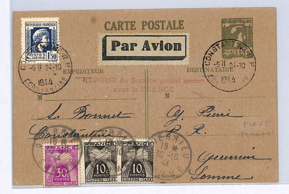 ALGERIA WW2 Air Mail 1944 Stationery Card French POSTAGE DUES France Cols WX150