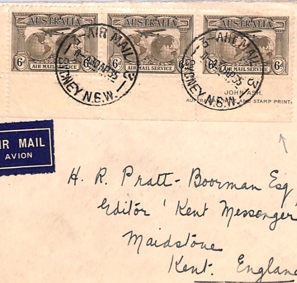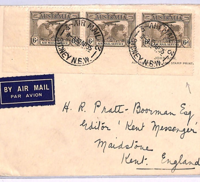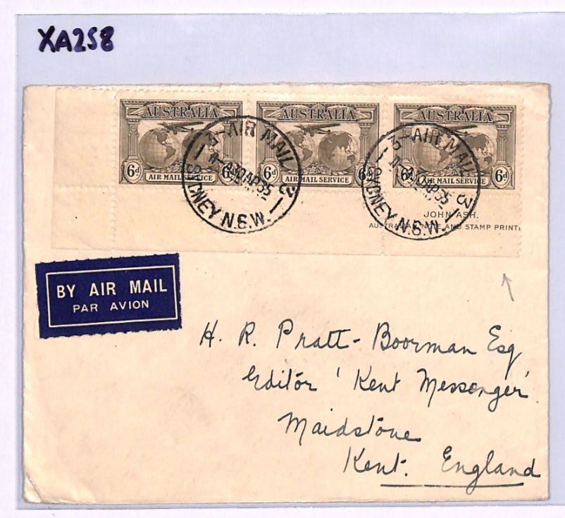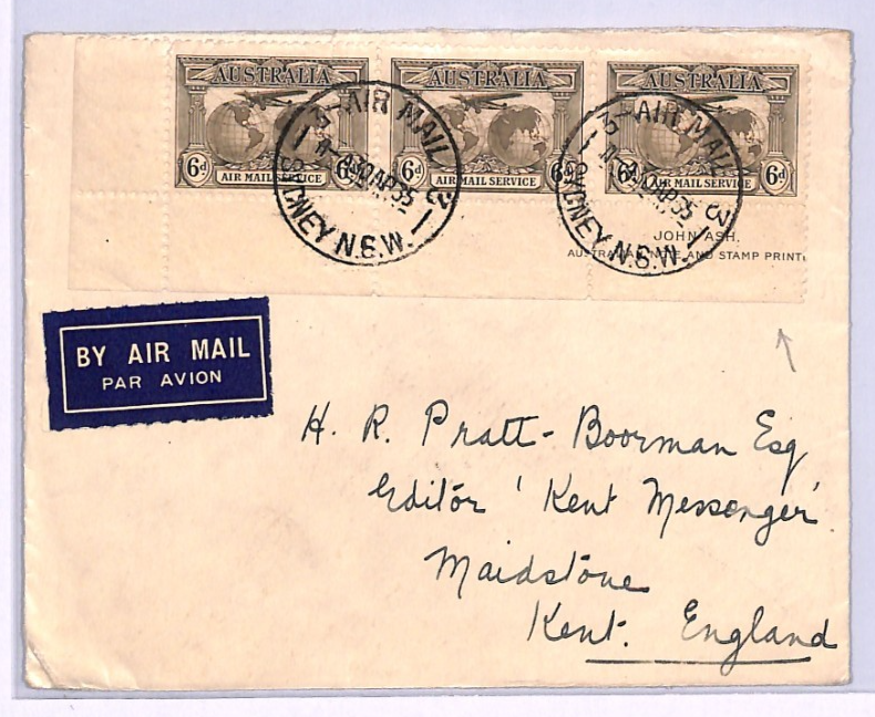 AUSTRALIA Air Mail Cover 6d Marginal Corner Strip{3} John Ash Imprint Sydney GB Kent Maidstone 1935 XA258