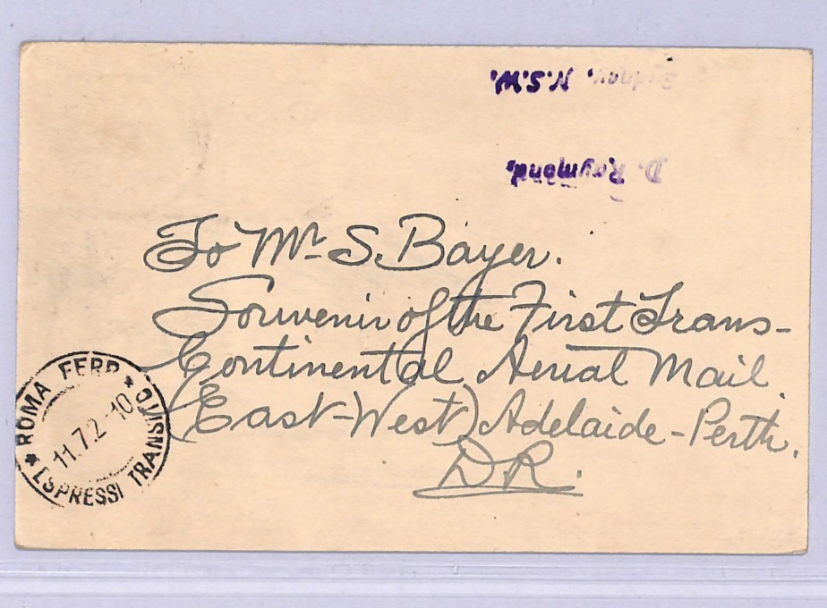 RARE ITEM flown on TRANSCONTINENTAL flight then on to ITALY addressed to Bayer in Rome. Bayer noted ONLY SIX POSTCARDS carried thus. Very Fine for an item of this type & period. Please look at all the scans to help form your own opinion (WAF).