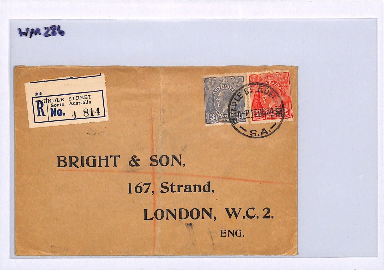 AUSTRALIA KGV 3d 2d Cover *DUNDLE ST* Adelaide Registered 1934 London WM286