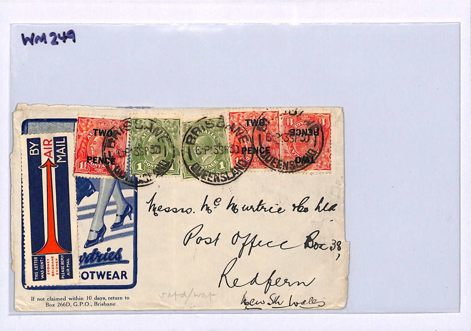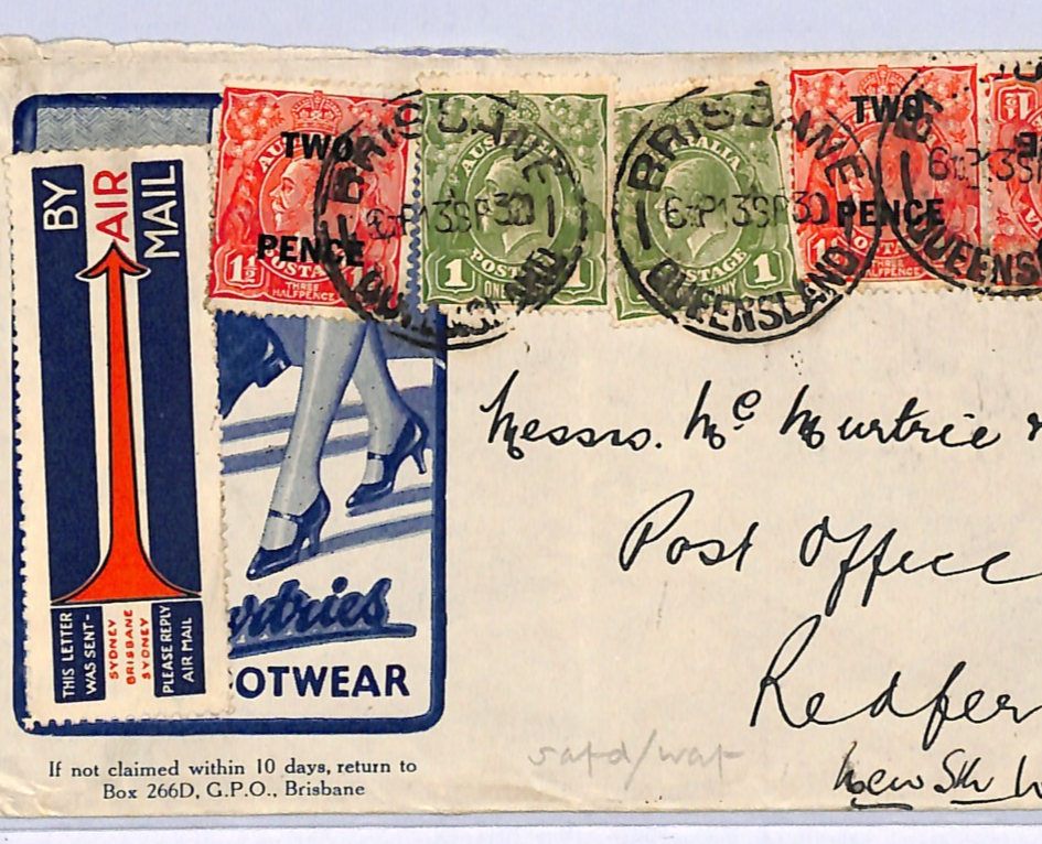 AUSTRALIA KGV ADVERT Cover Illustrated *SHOES* Brisbane Air Mail Redfern WM249
