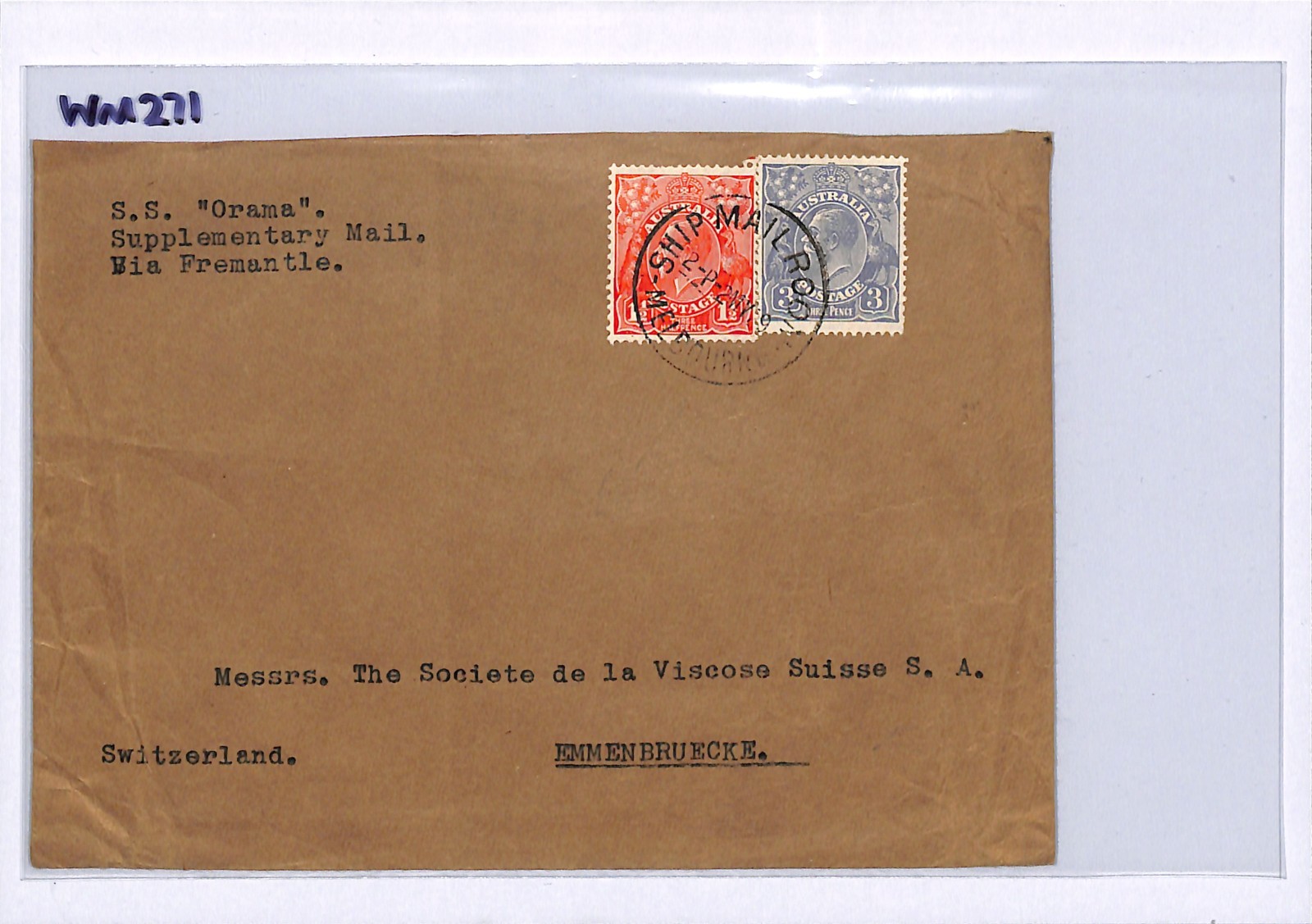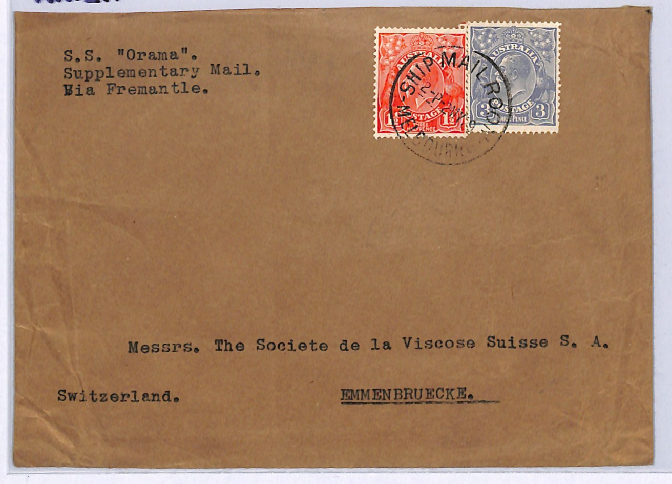 AUSTRALIA KGV Cover SS ORAMA *SHIP MAIL ROOM* CDS Melbourne Switzerland Emmenbrücke 1929 WM271
