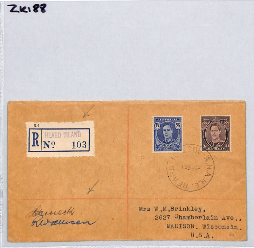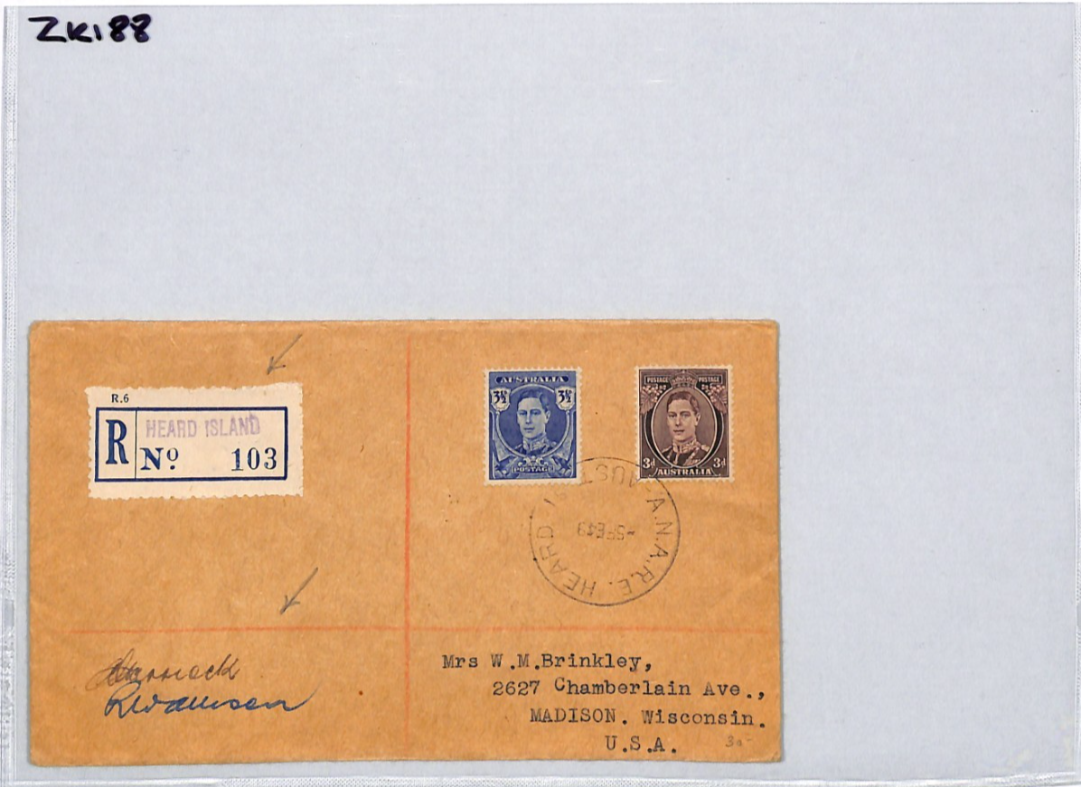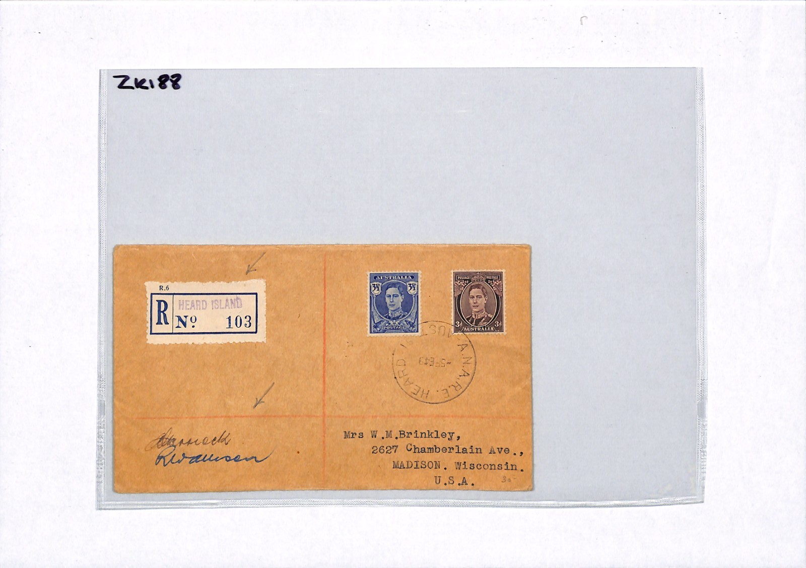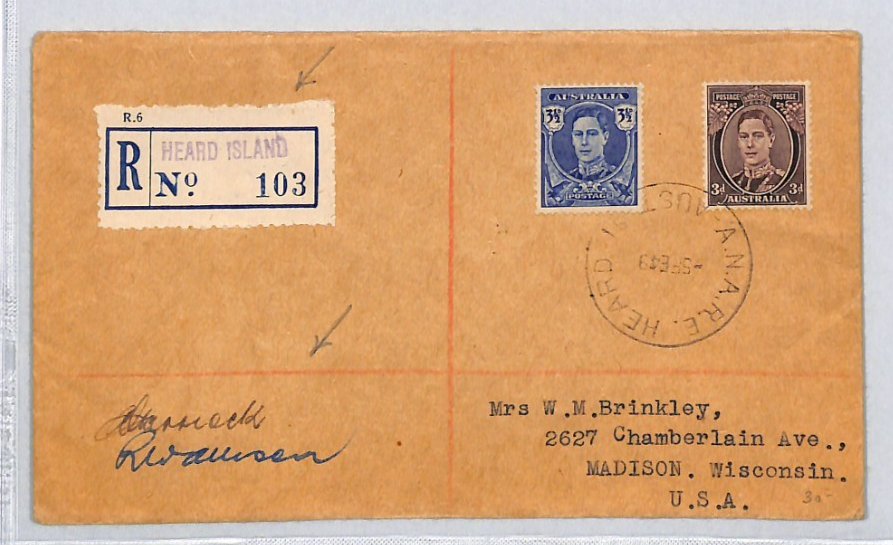AUSTRALIA Registered Cover *HEARD ISLAND* 1949 USA {samwells-covers}ZK188