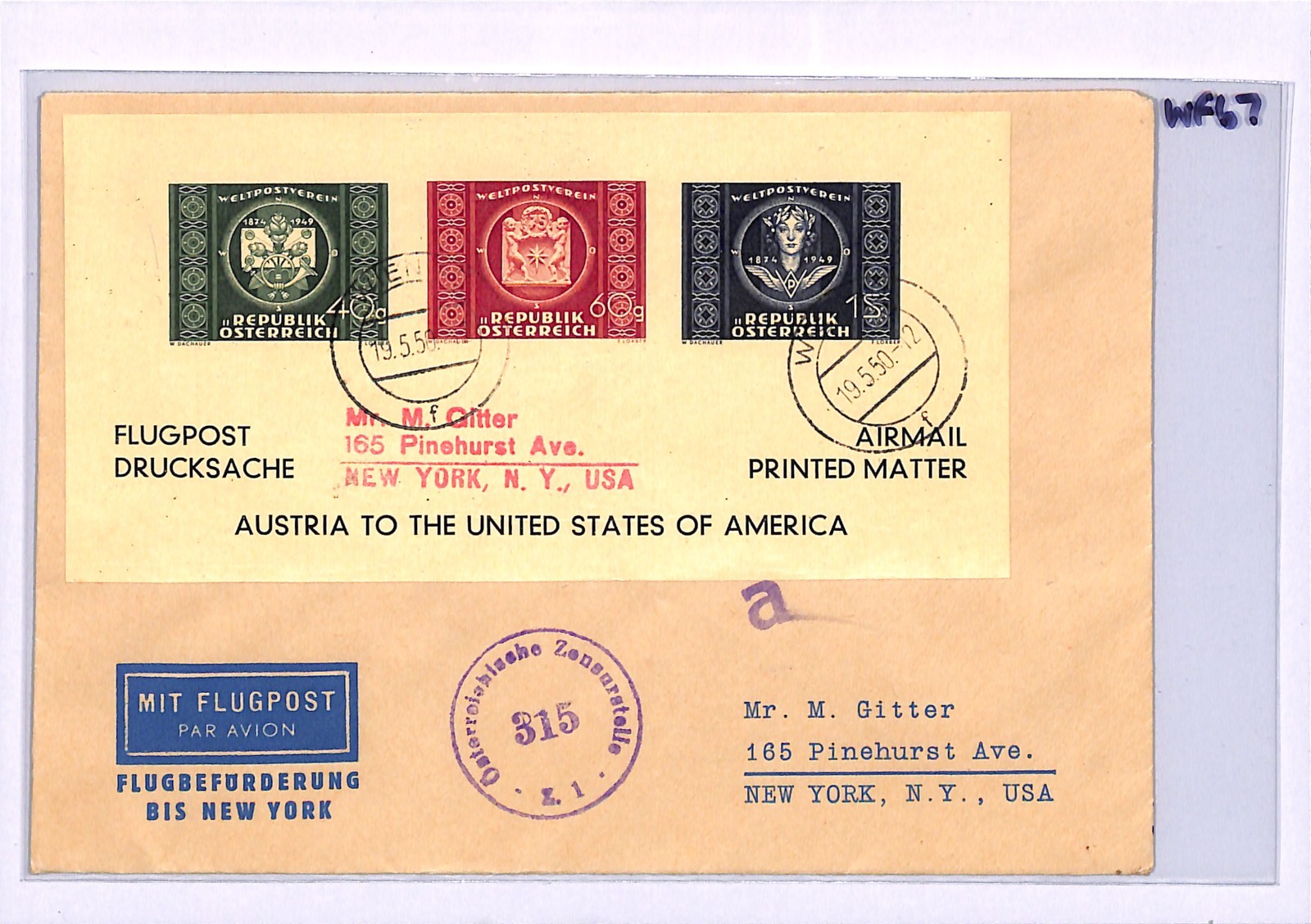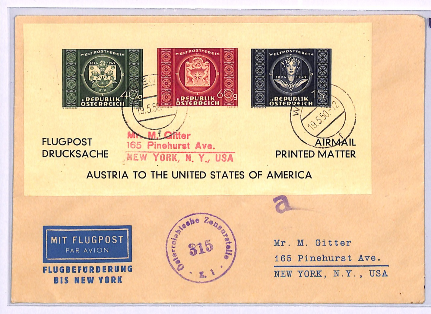 AUSTRIA Air Mail Cover 1949 UPU ANNIVERSARY 1950 Imperf Miniature Sheet USA New York Vienna Censor WF67