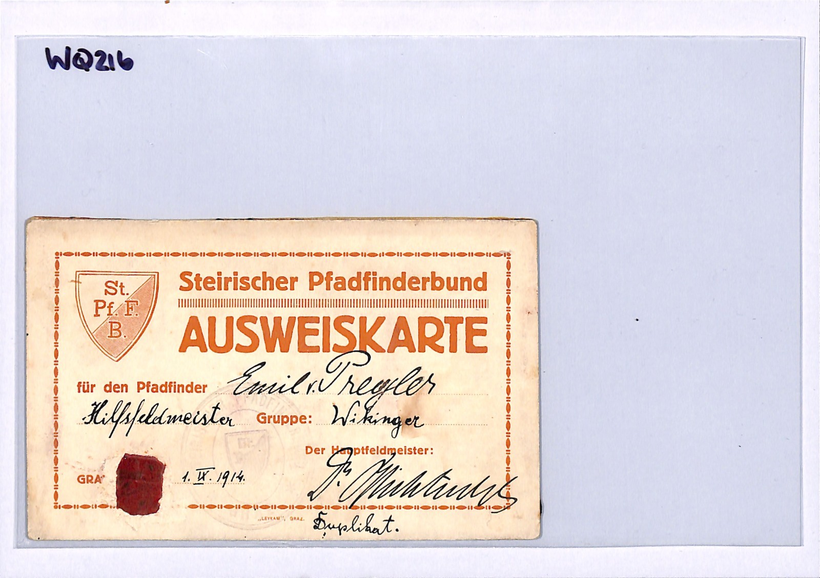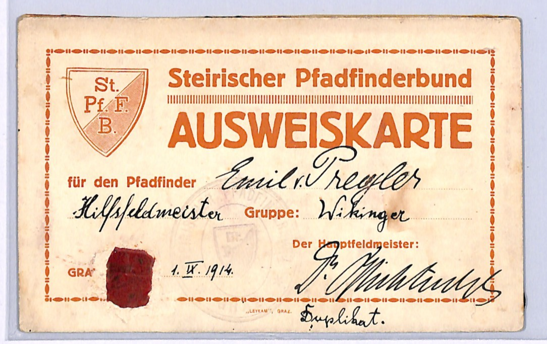 AUSTRIA BOY SCOUTS ID CARD STEIRISCHER PFADFINDERBUND 1914 WQ216