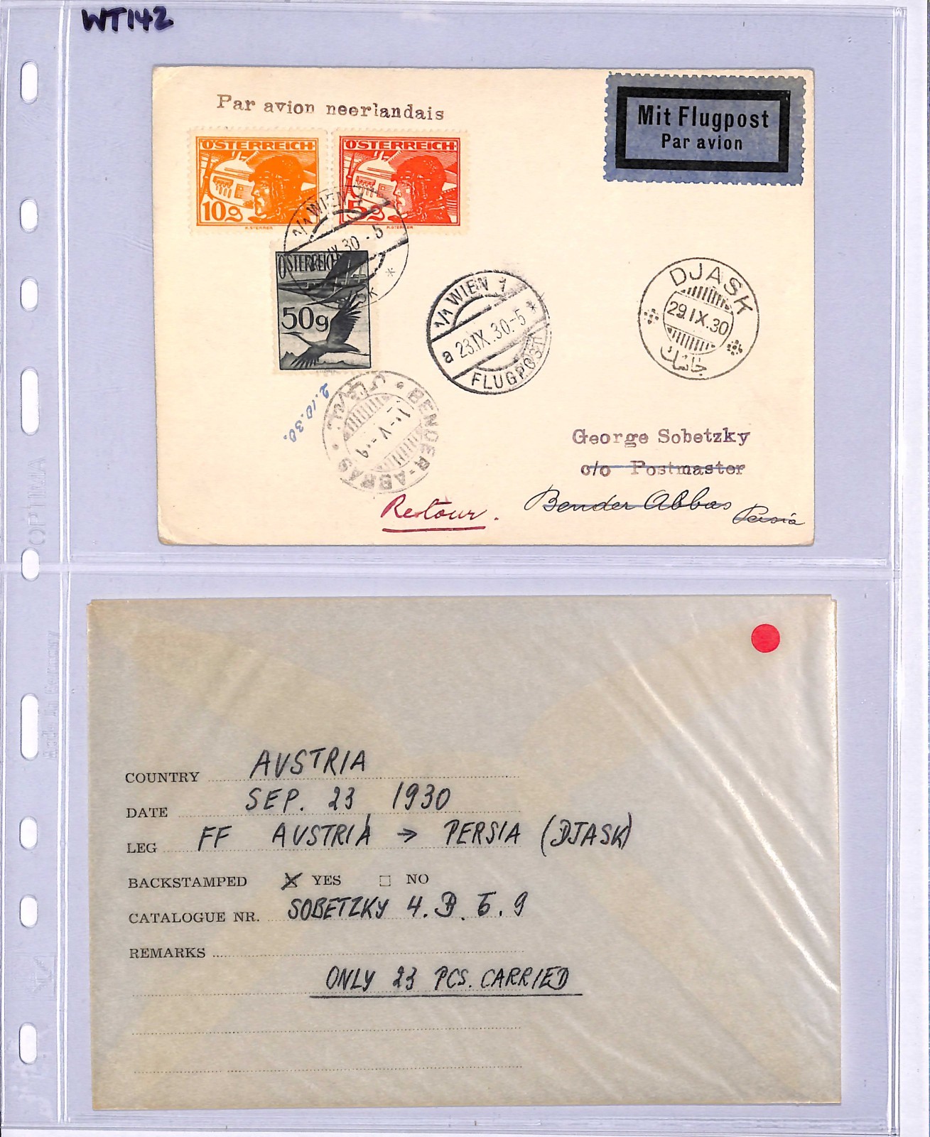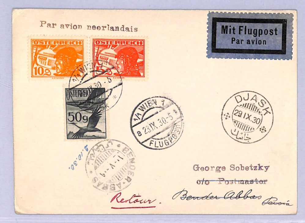 AUSTRIA Air Mail Card 1930 FIRST FLIGHT MIDDLE EAST/GULF Djask Bander Abbes Vienna WT142