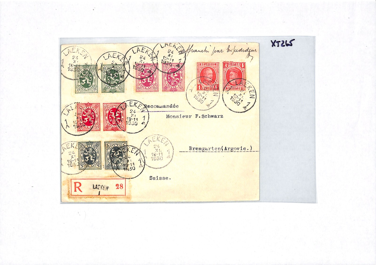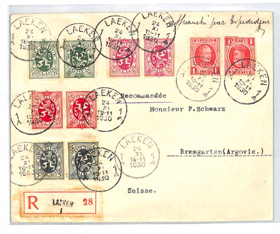 BELGIUM Cover Laeken Registered 1Fr Switzerland Bremgarten 1930{samwells}XT265