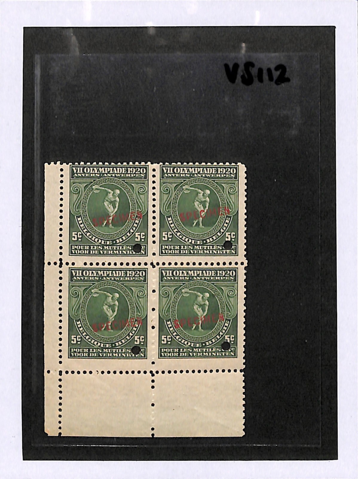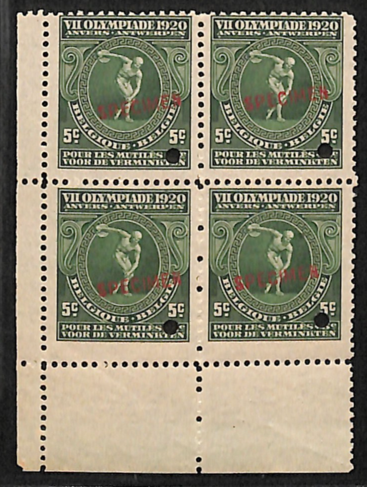 Belgium OLYMPIC GAMES 1920 ANTWERP 5c *SPECIMEN* Stamps Block{4} Mint MM VS112