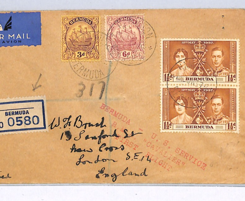 BERMUDA Air Mail Cover RMA CAVALIER FIRST FLIGHT GB London Registered 1937 WX98
