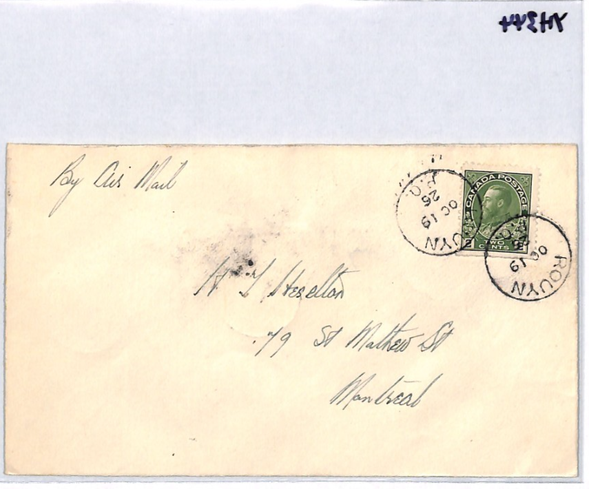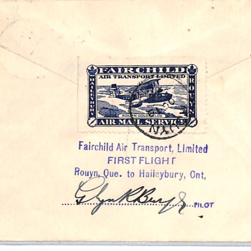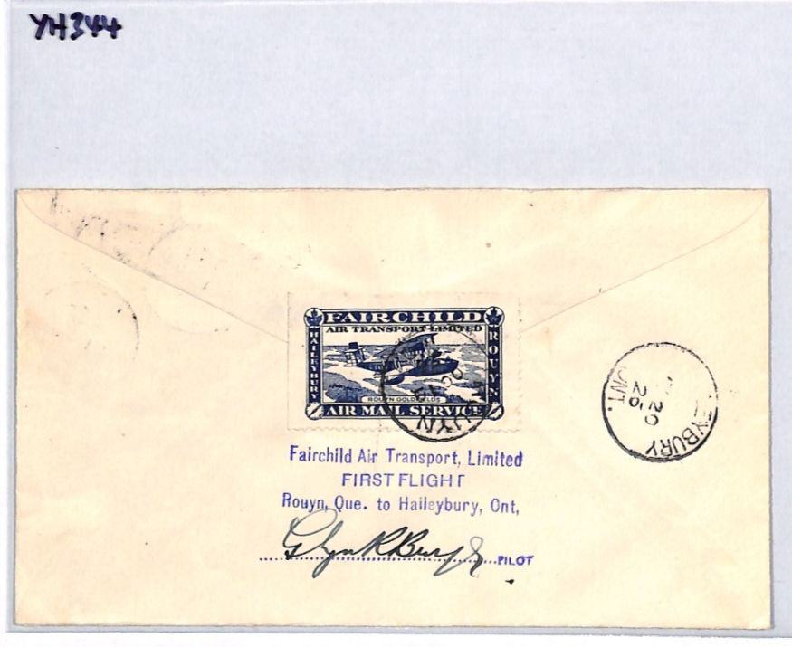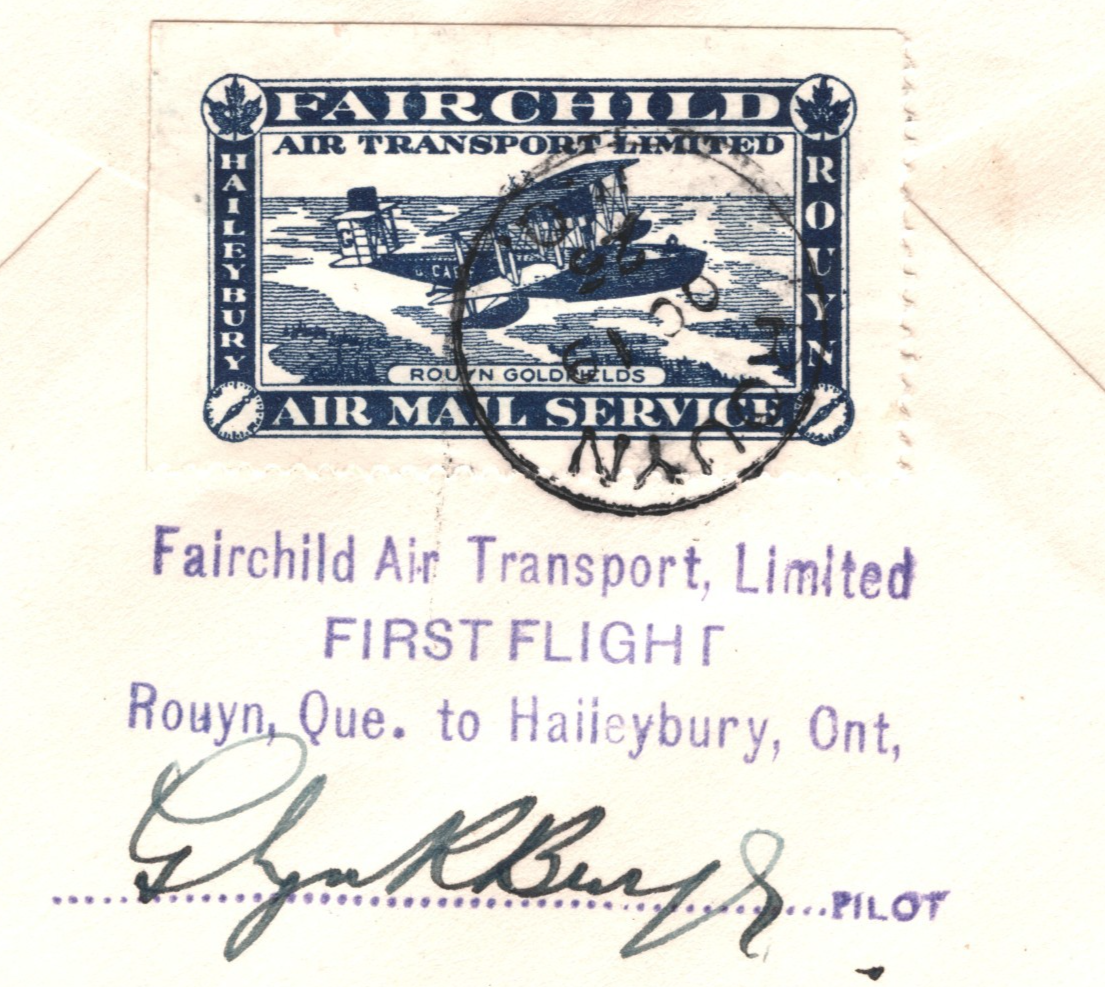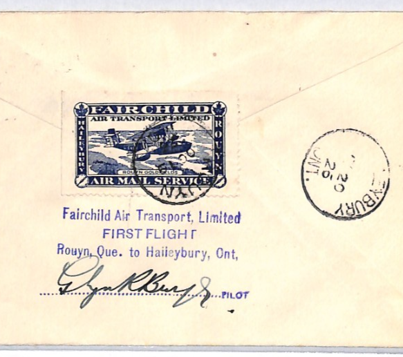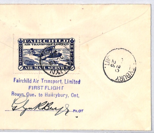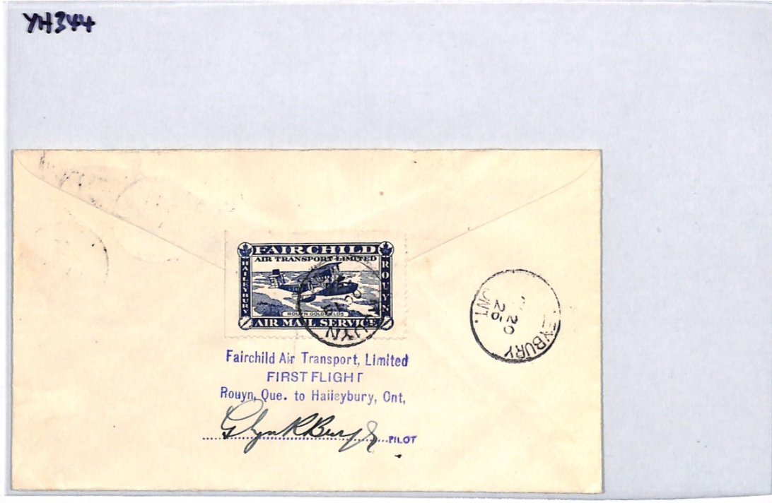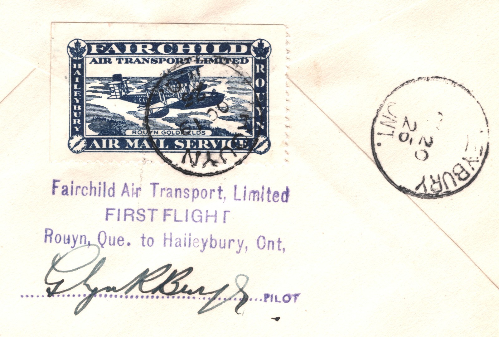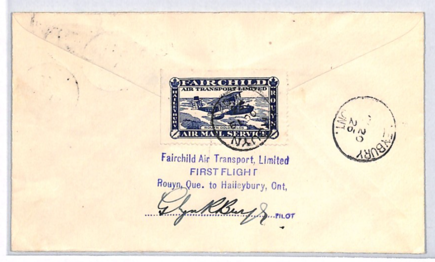CANADA FIRST FLIGHT Air 1926 ROUYN Cover *FAIRCHILD* (25c) FLYING BOAT CORNER MARGINAL Pilot SIGNED Haileybury Cachet Reverse YH344