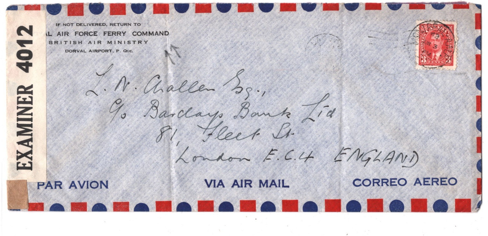 CANADA WW2 Air Mail Cover RAF FERRY COMMAND Montreal DORVAL AIRPORT Quebec 1942 Censor London Mail KT128