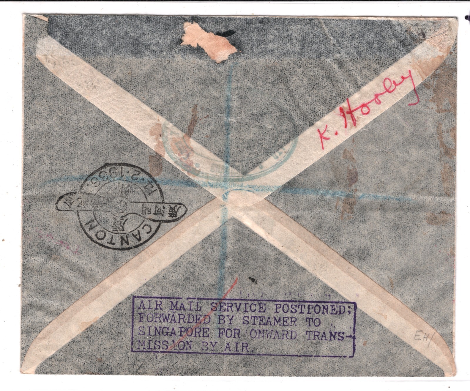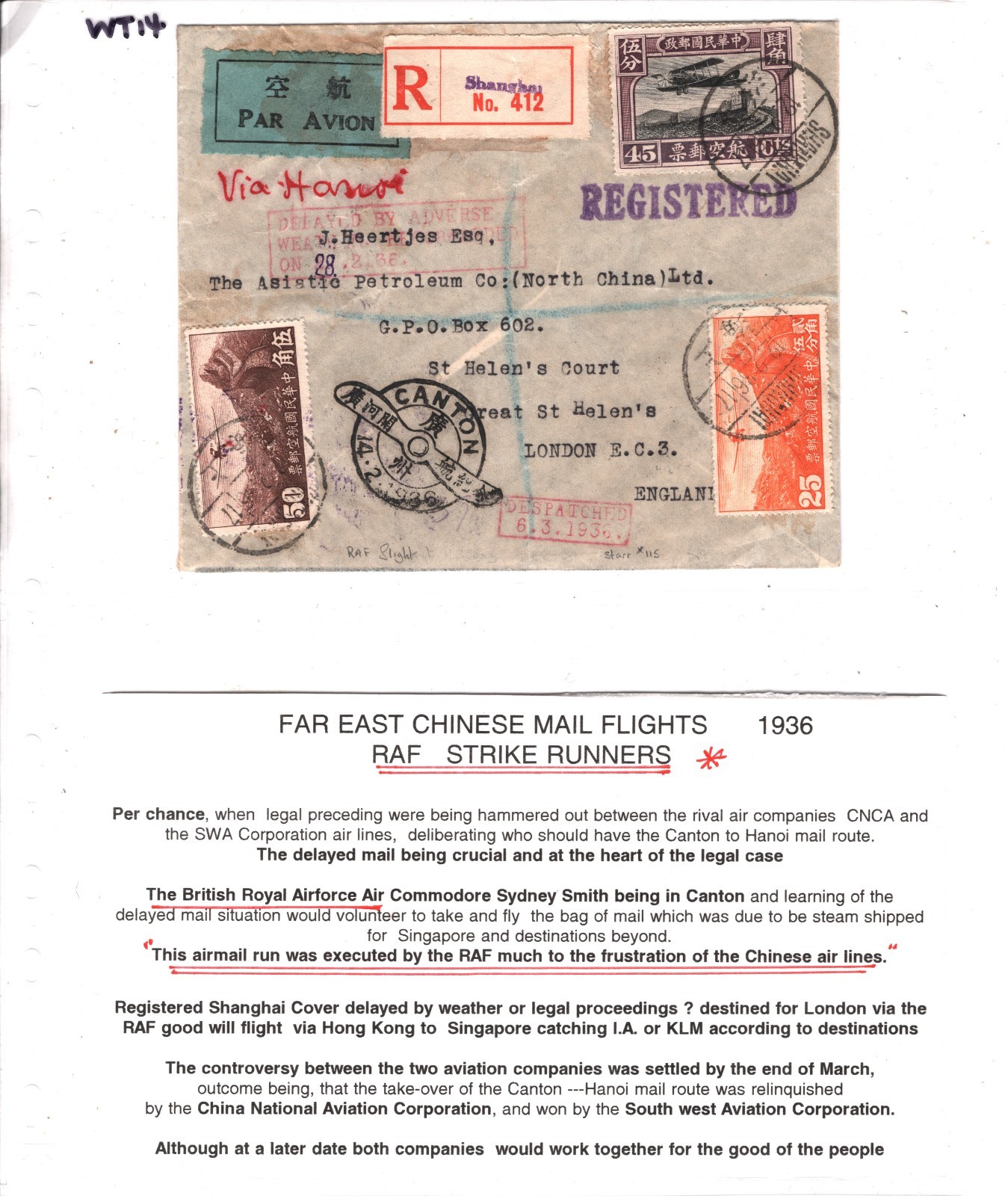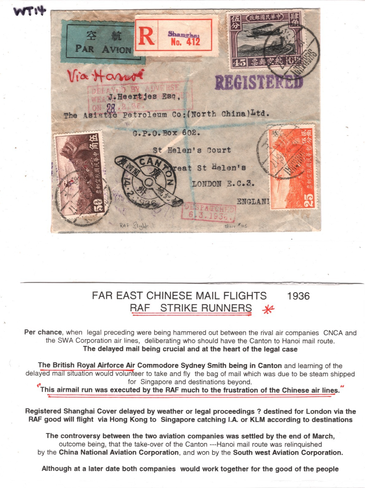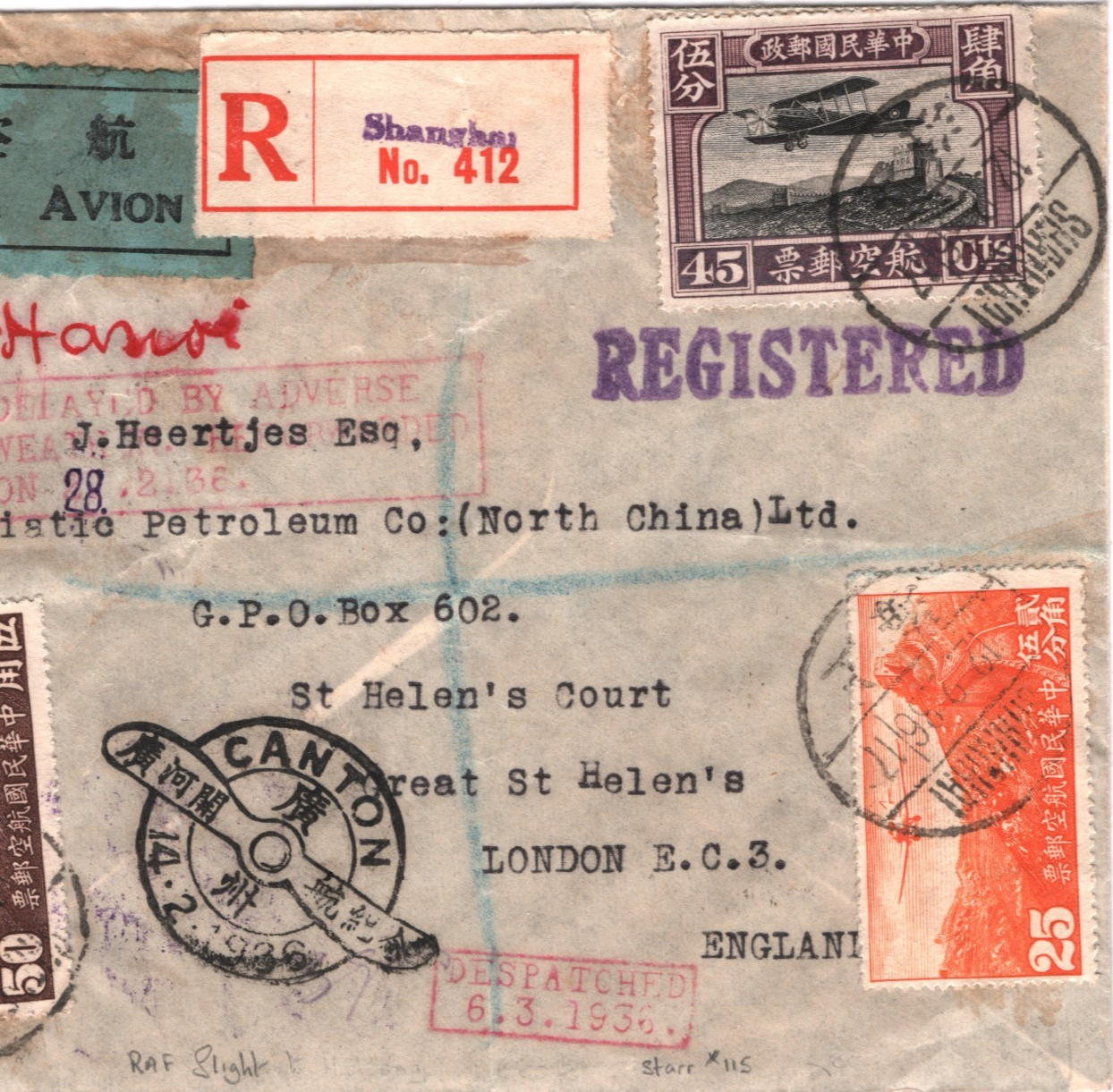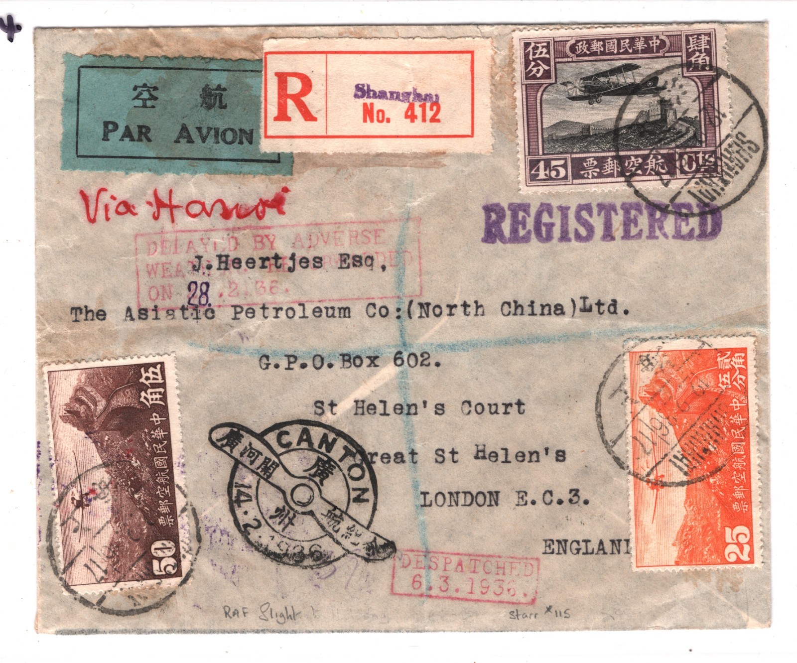 CHINA Air Mail Cover *RAF STRIKE RUNNERS FLIGHT* Canton Commodore *Sydney Smith* Shanghai GB London 1936 DELAYED BY ADVERSE WEATHER Special Canton PROPELLER CDS {samwells}WT14