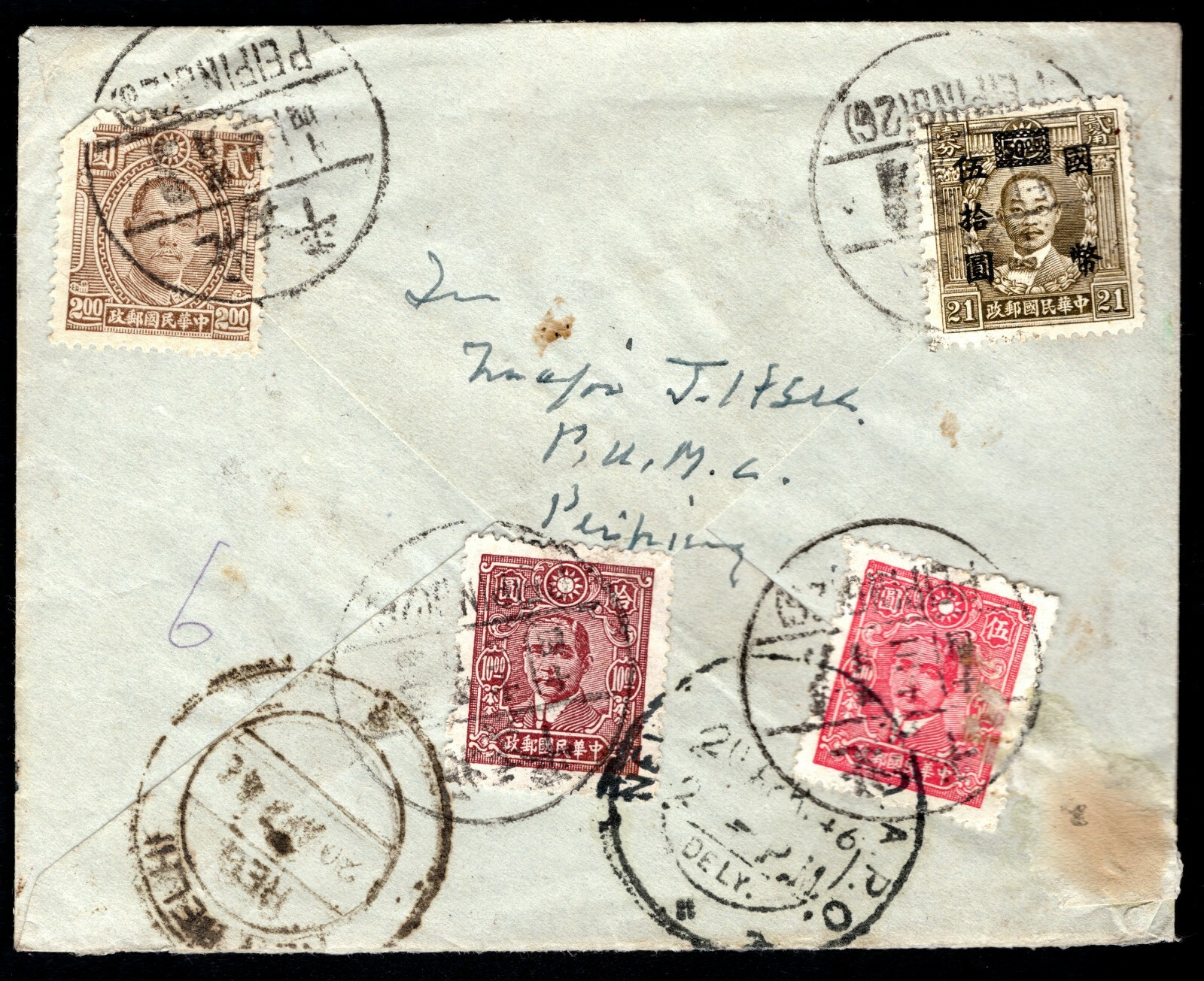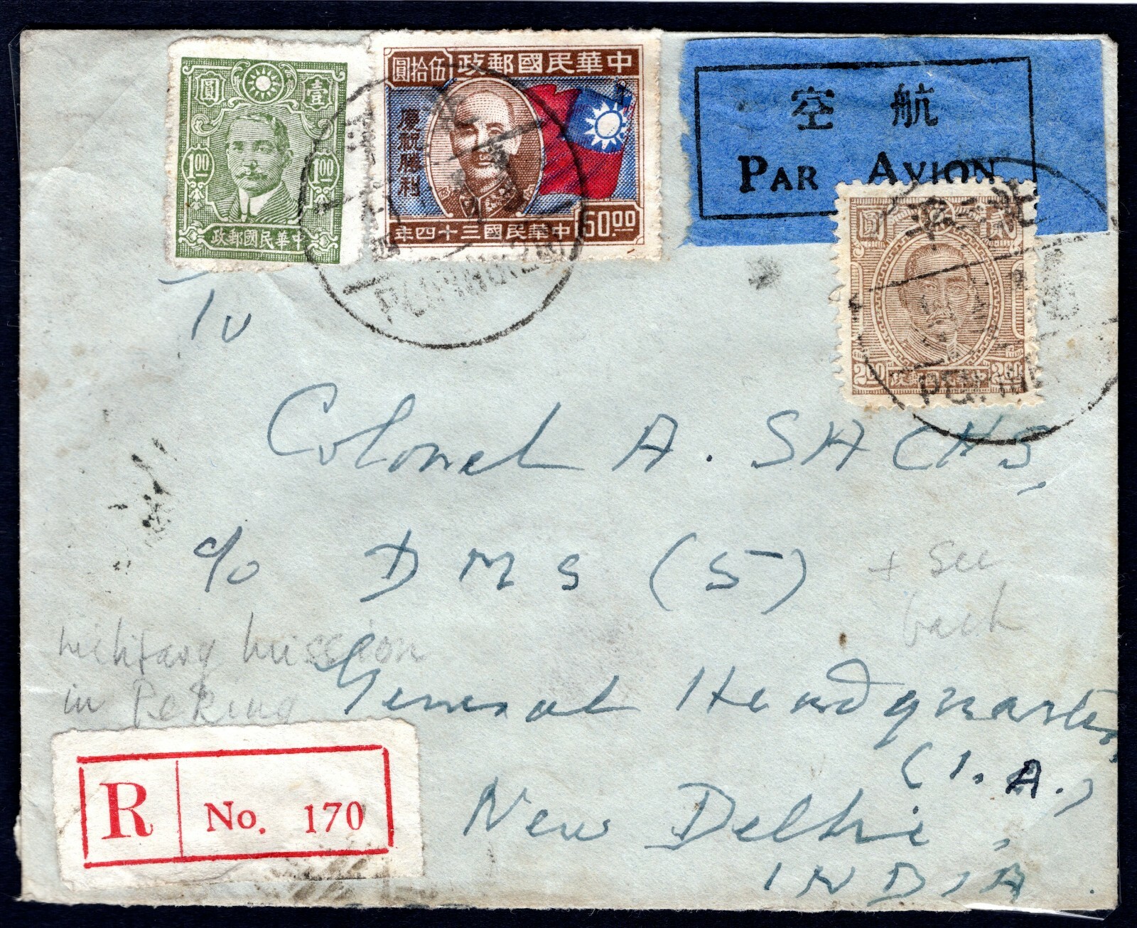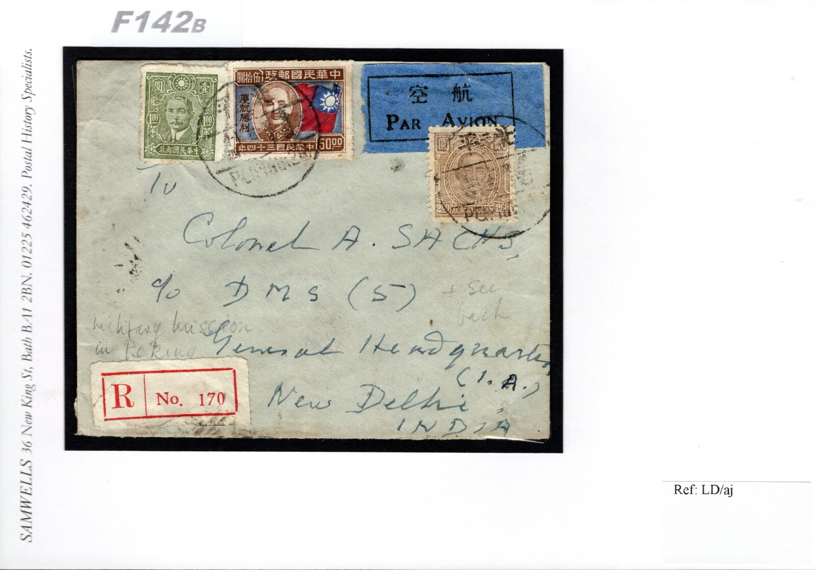 CHINA Cover Peking Registered MISSIONARY India Delhi 1946{samwells-covers}F142b