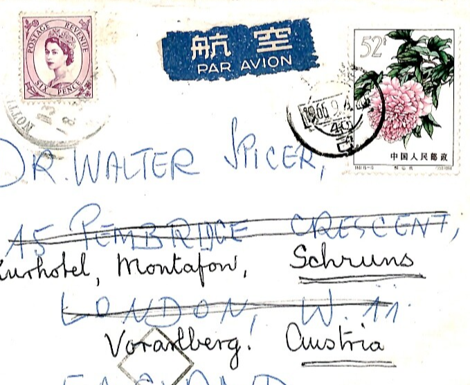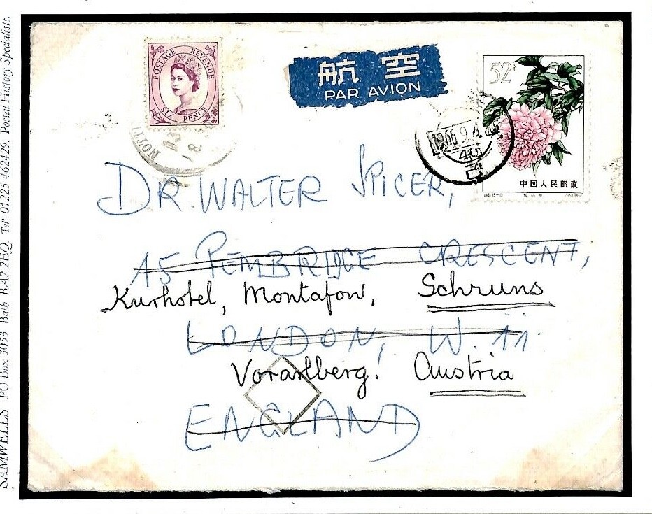 CHINA PRC 52f High Value FLOWERS Franking Shanghai Air Mail Cover GB FORWARDED Austria 1966 Q109a