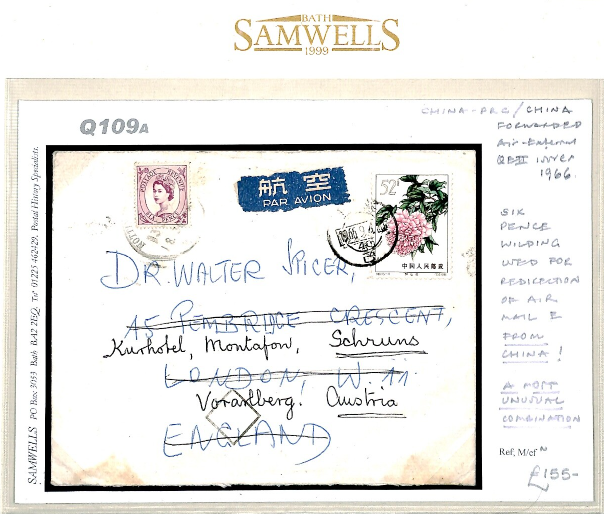 CHINA PRC/GB QEII *Mixed Franking* 1966 Cover 52f High Value FLOWERS Air Q109a