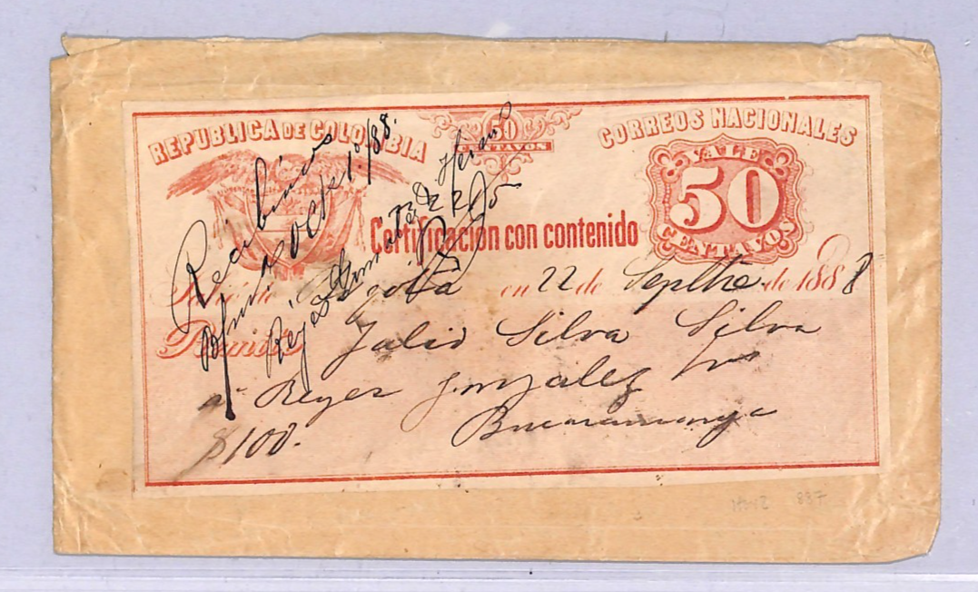 COLOMBIA Cover Registered CUBIERTA Used 1888 Bogota Bucaramanga 50c Stationery WT94