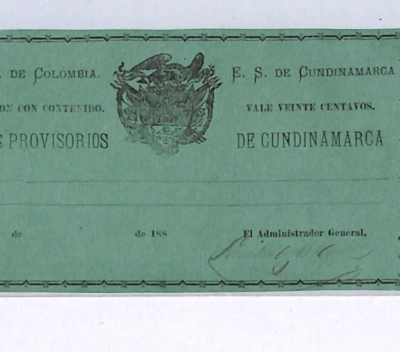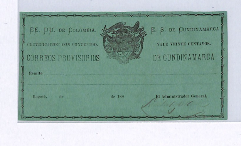 ISSUE FOR CUNDIMARCA on coloured paper. Unused. VERY SCARCE. Very Fine for an item of this type & period. Please look at all the scans to help form your own opinion (WAF).
