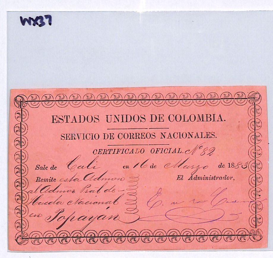 COLOMBIA Official CUBIERTA Used 1883 Cali *UNRECORDED PINK PAPER* Variety WX37