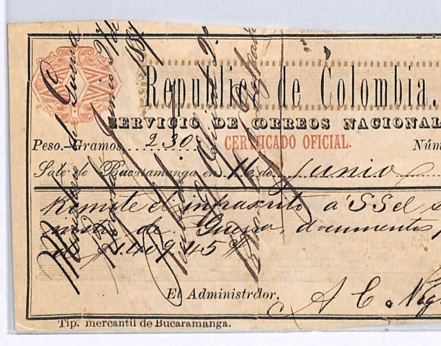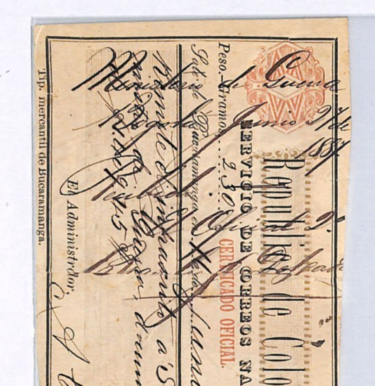 COLOMBIA Republica BUCARAMANGA CUBIERTA Insured Letter Stamp 1887 Rare GO19 WX91