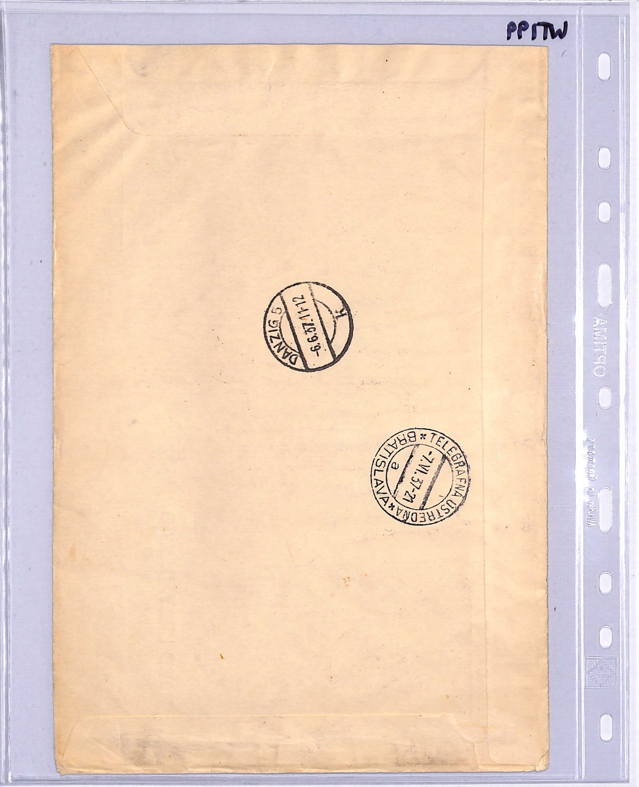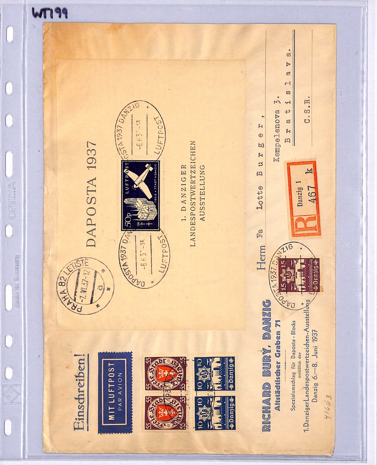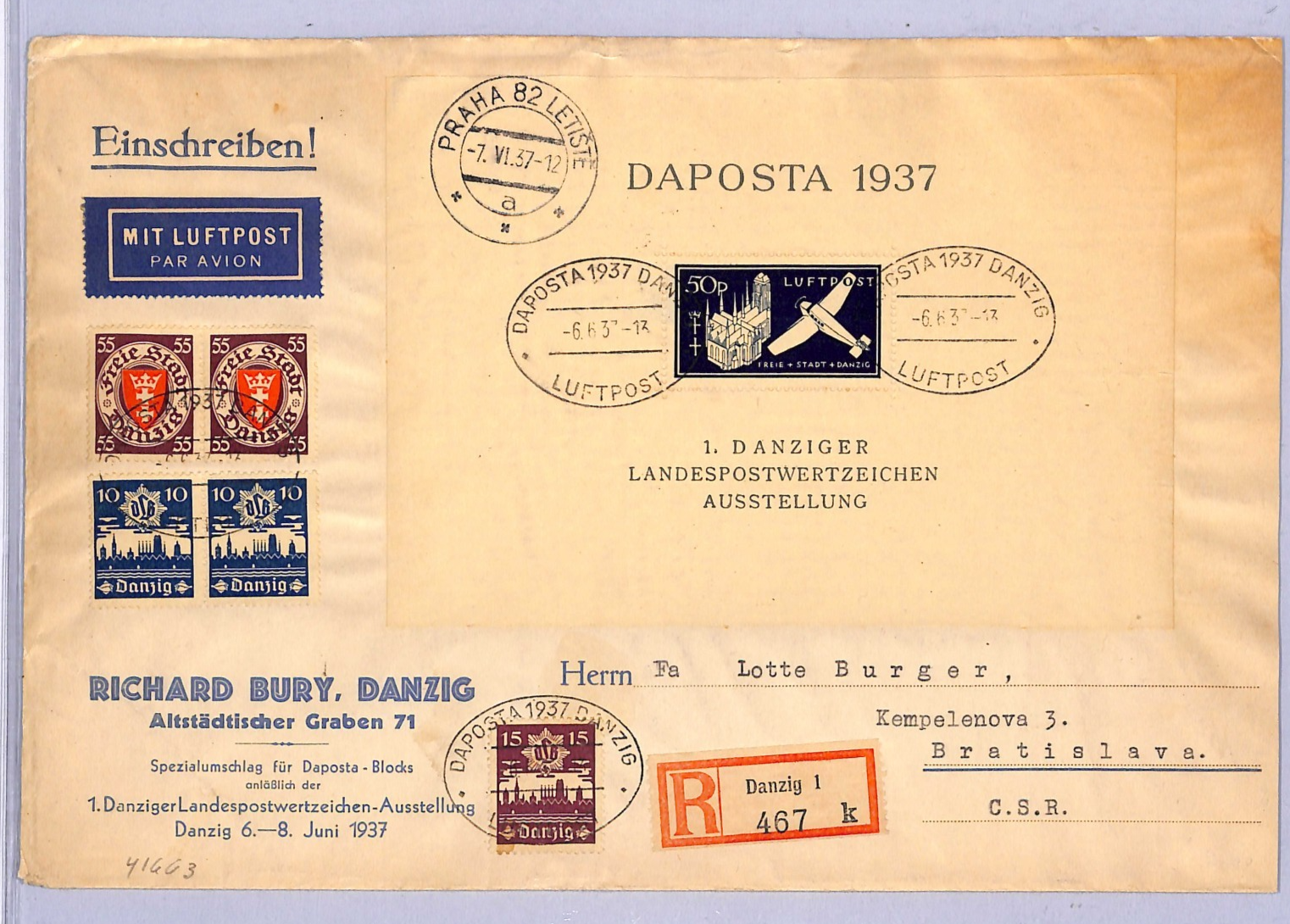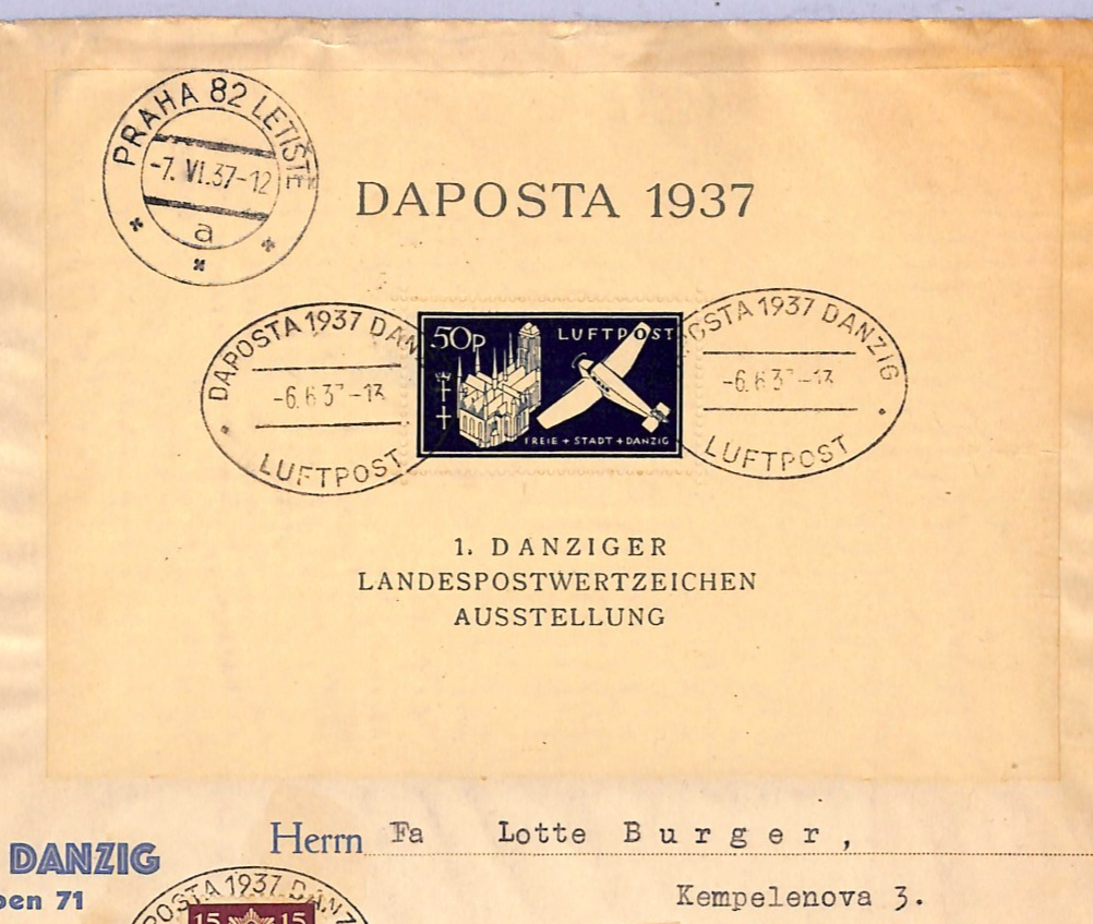 DANZIG Germany/Poland Air Mail Cover 1937 DAPOSTA STAMP EXHIBITION Miniature Sheet Czechoslovakia Bratislava Registered WT199