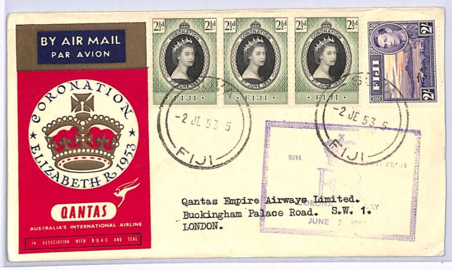 FIJI 1953 ILLUSTRATED FDC QEII *Coronation* KGVI 2s QANTAS SPECIAL FLIGHT XH322