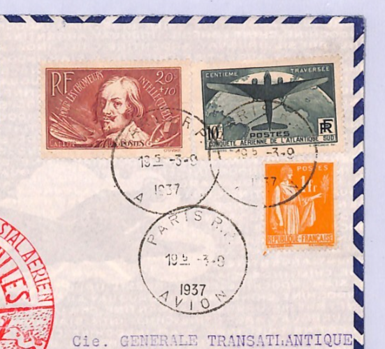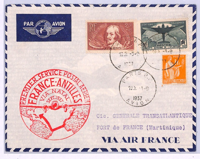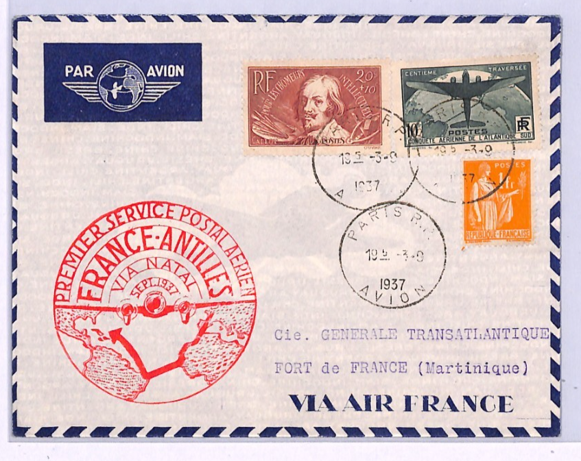 FRANCE Air Mail 10f HIGH VALUE (1936) Cover FIRST FLIGHT Antilles 1937 Superb Cachet Scott.C17 Cat $175 XA138