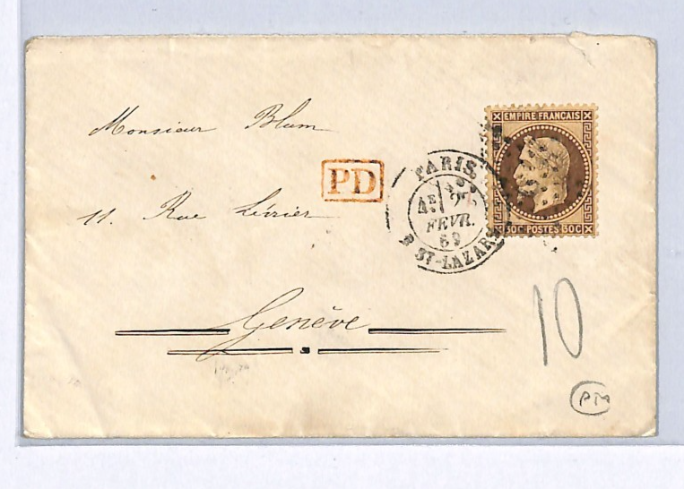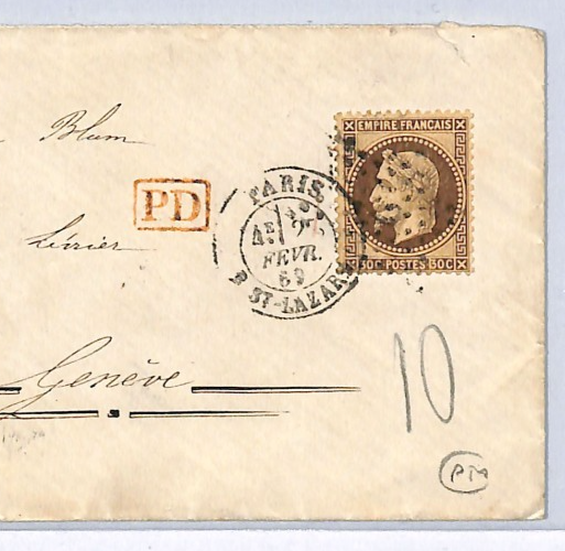 FRANCE Cover Paris Switzerland Geneva 1869{samwells-covers}WZ22