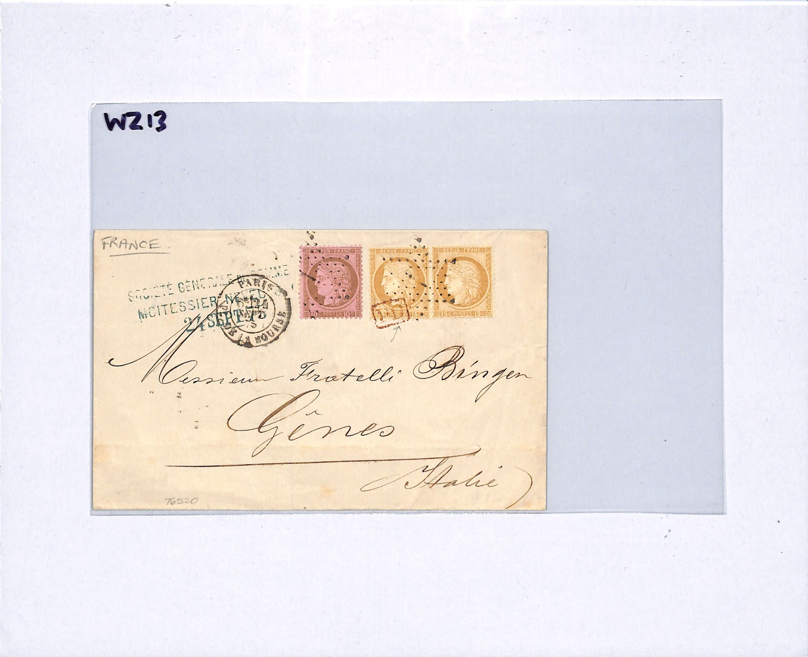 FRANCE Cover Paris Société Générale de Moitessier Neveu ITALY Genoa 1875 WZ13