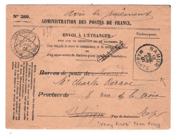 FRANCE Cover BELGIUM Super *NAMUR MANDATS* Cancel Rare 1901 CDS {Tom Pring}XD62