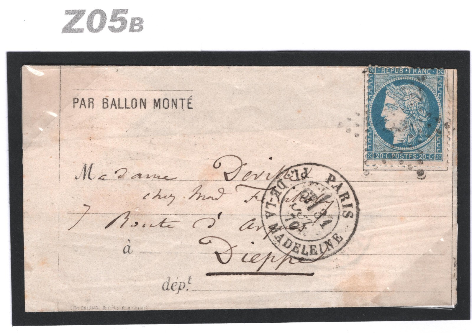 FRANCE Cover *PAR BALLON MONTE* 1870 PARIS SIEGE Air Mail BALLOON Dieppe Z05b
