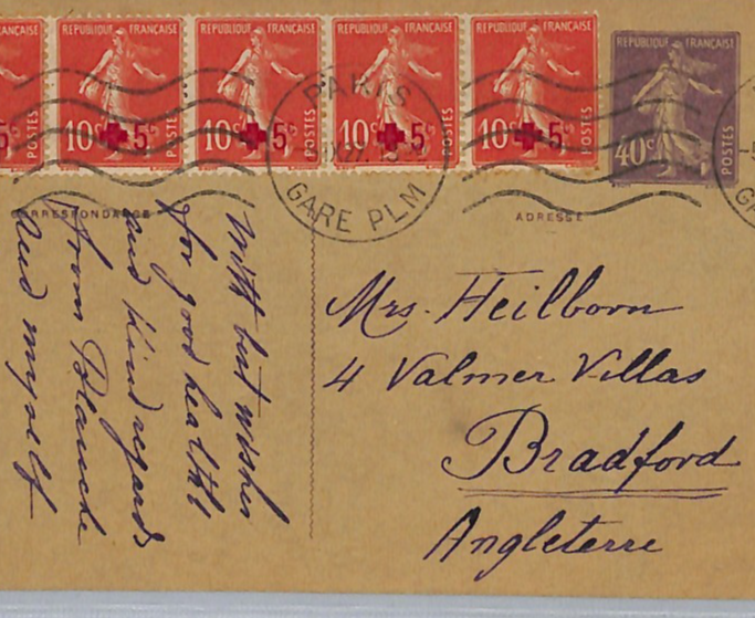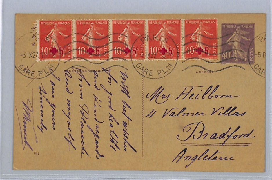 FRANCE SOWER Stationery Card RED CROSS Block{5}Uprated Paris Bradford 1927 WZ210