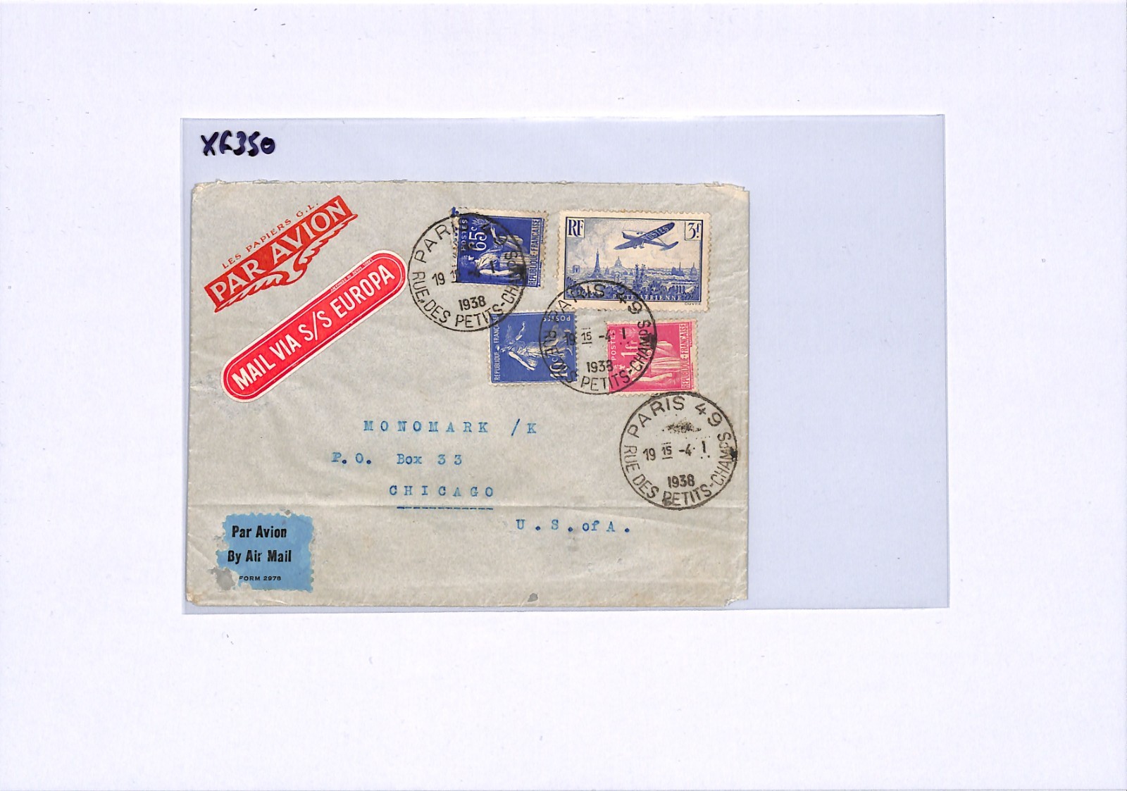 FRANCE Air Mail Cover SS EUROPA USA Chicago Paris 1938{samwells-covers}XF350