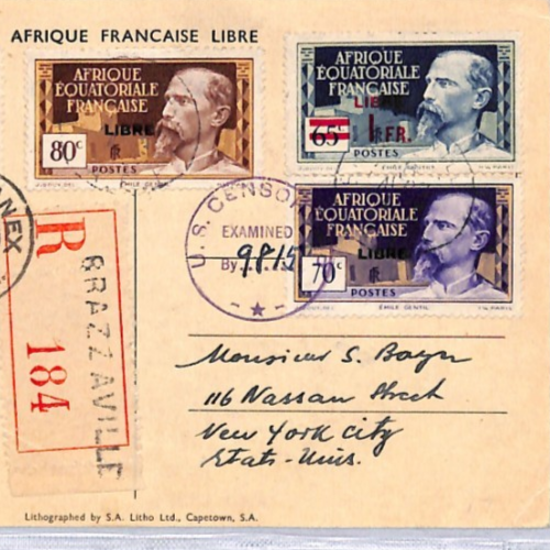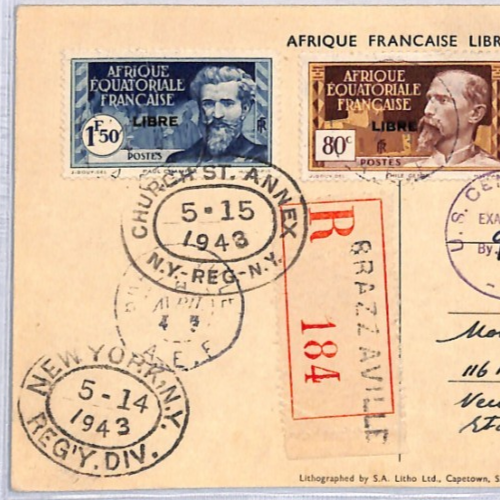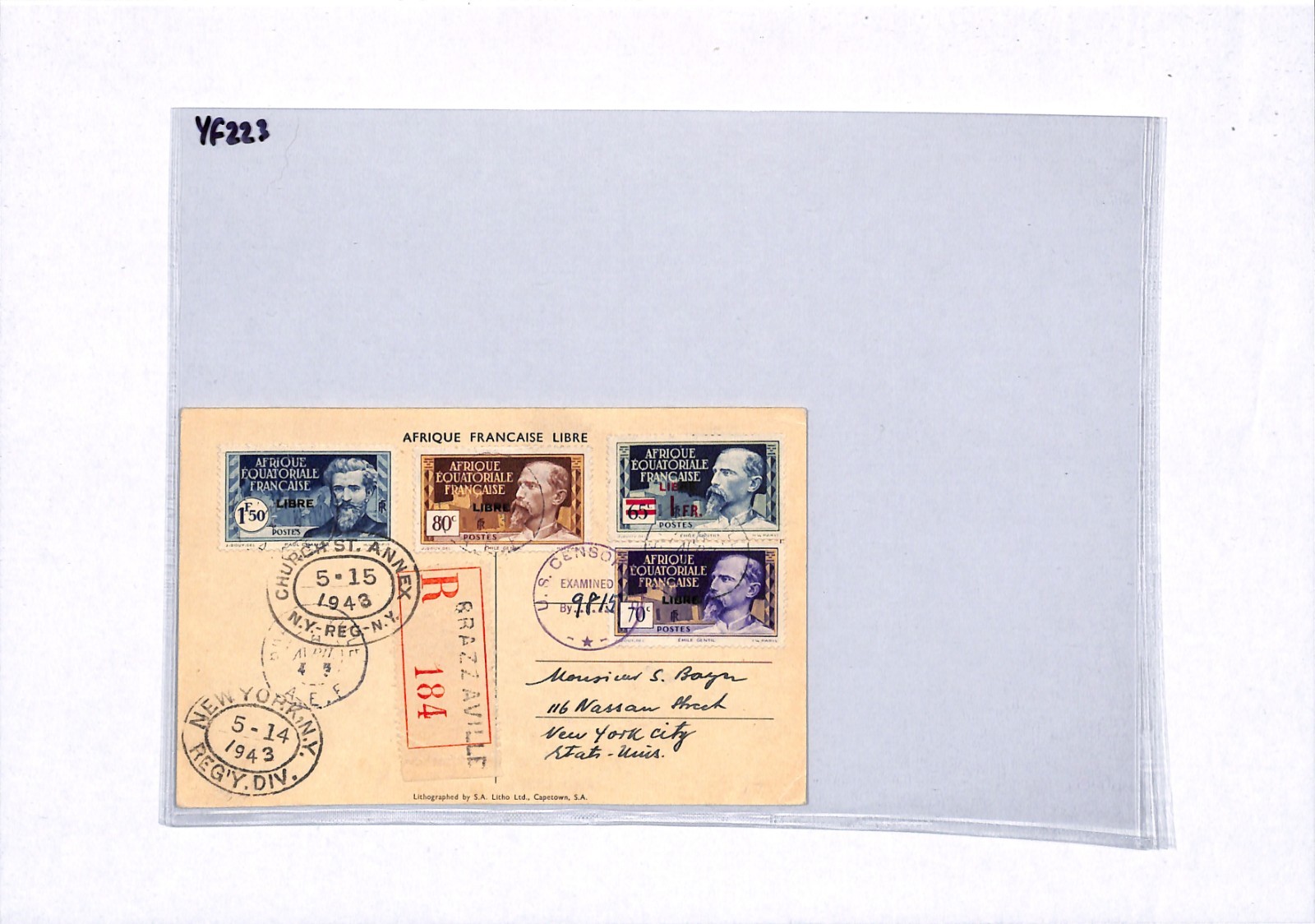 FRENCH CONGO *LIBRE* WW2 Stamps DE GAULLE Registered Postcard Brazzaville 1943 Censor USA YF223