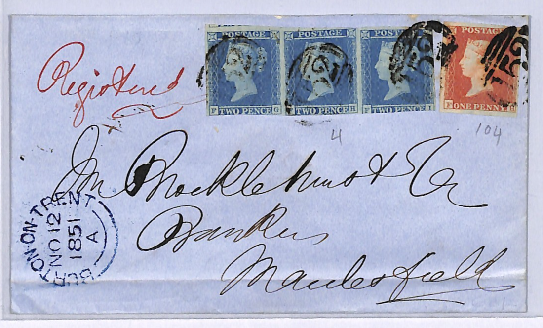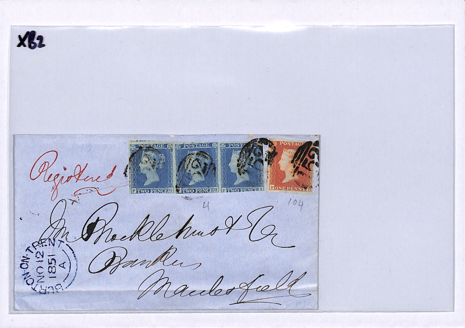 GB 1841 2d BLUE STRIP{3} Burton Staffs 1851 *REGISTERED* Cover Macclesfield XB2