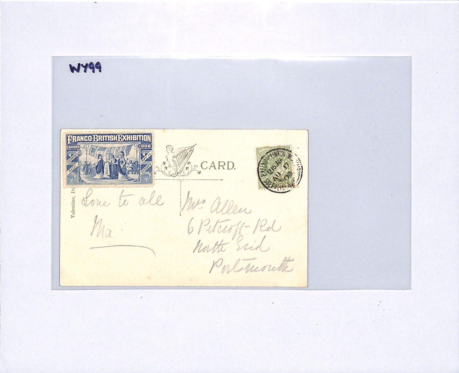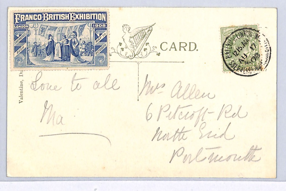 GB FRANCO-BRITISH EXHIBITION Postcard 1908 Label Irish Village PPC{Samwells} Portsmouth WY99