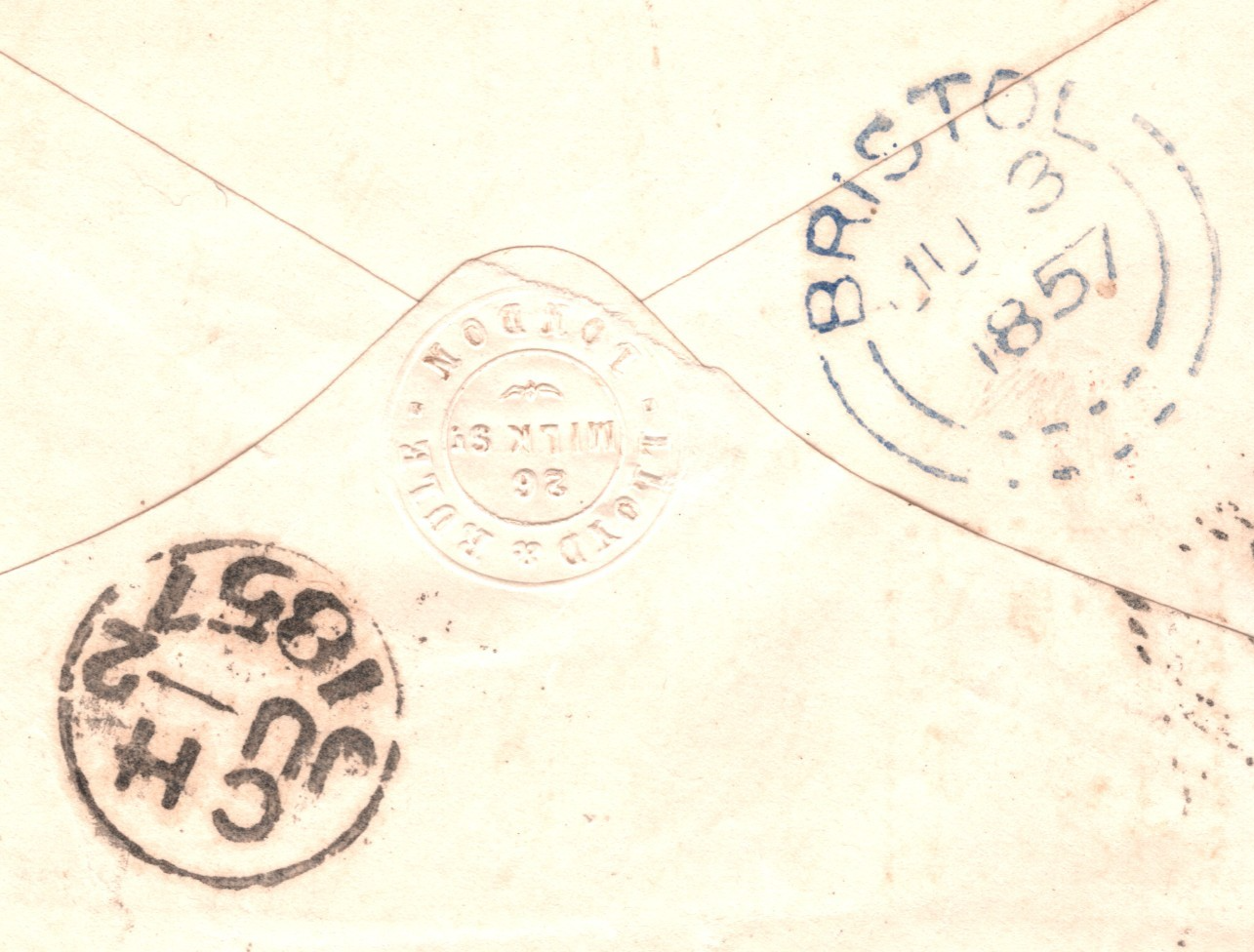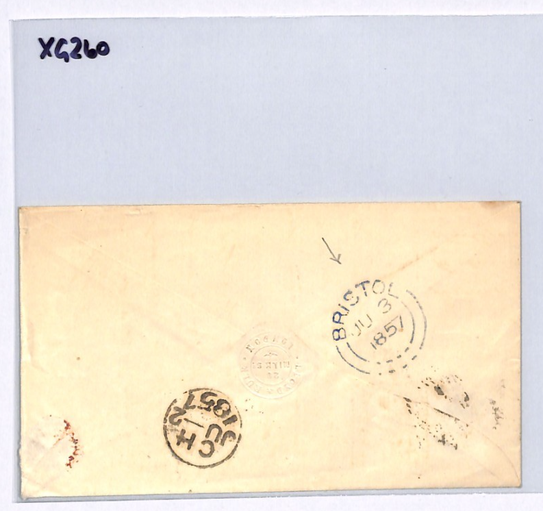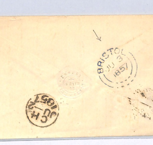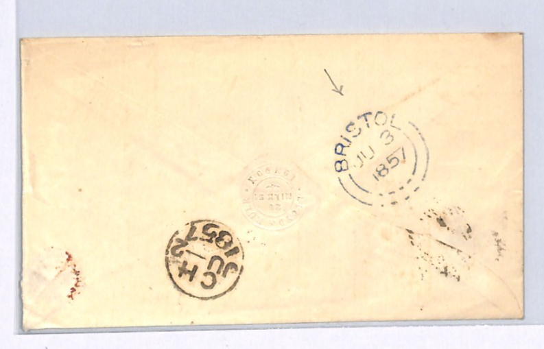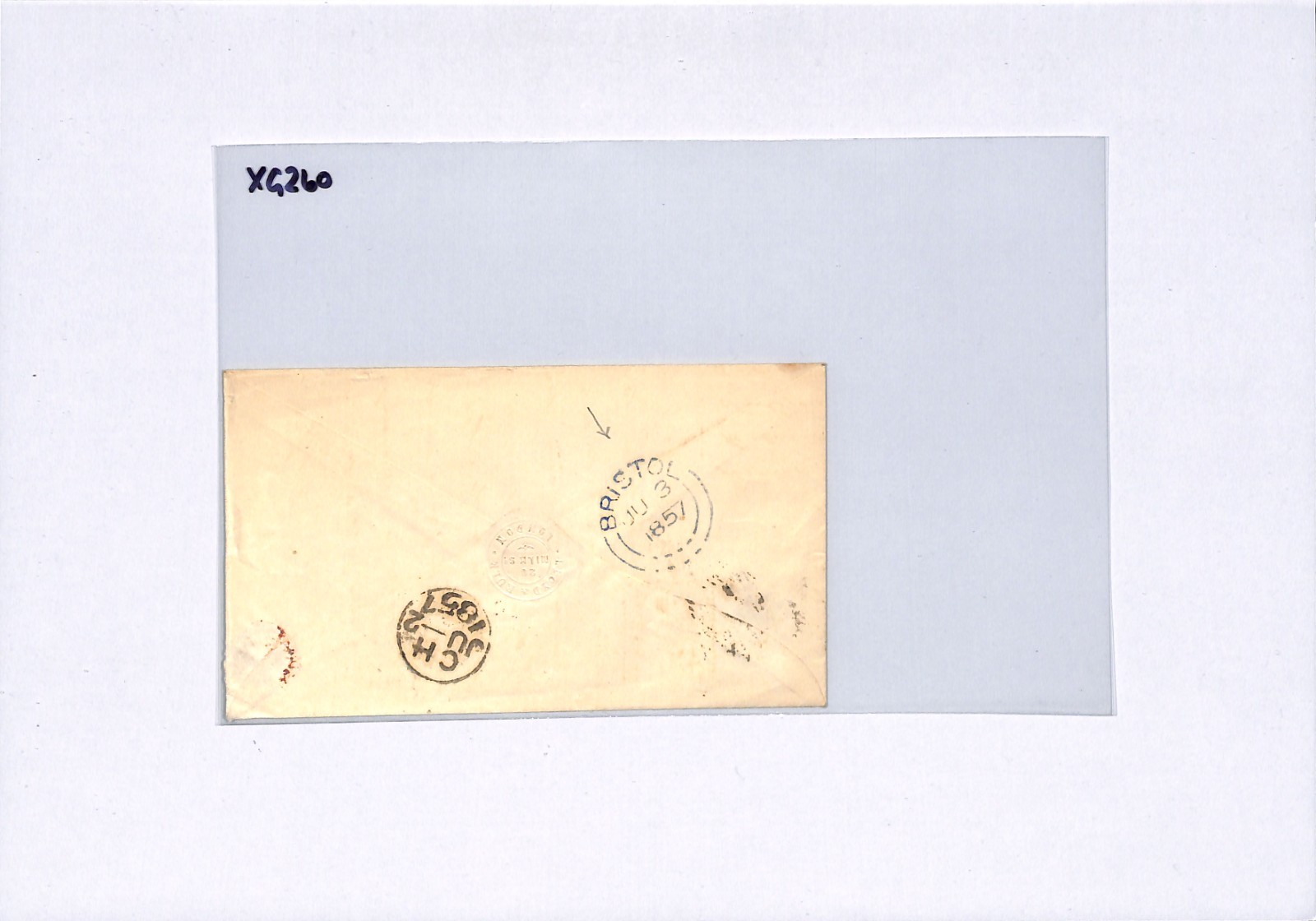 GB GWR RAILWAY MAIL QV Cover 1857 Rare *BRISTOL STATION* TRANSIT 5-CUTS CDS 1d Rose SG Spec C9A XG260