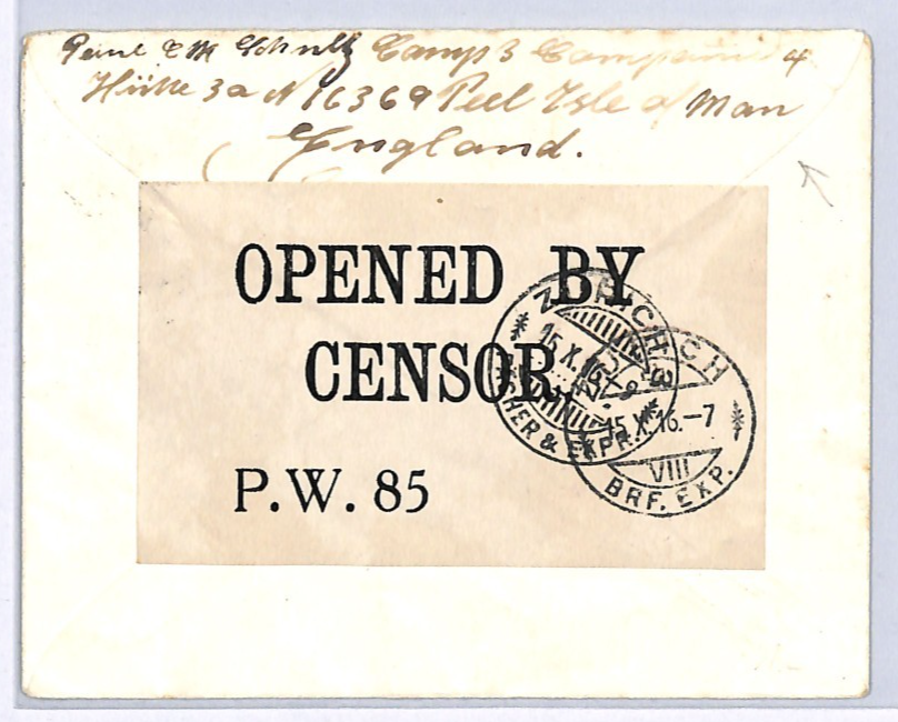 GB ISLE OF MAN WW1 POW MAIL Cover Peel Switzerland Zurich 1916{samwells}WY258