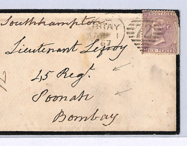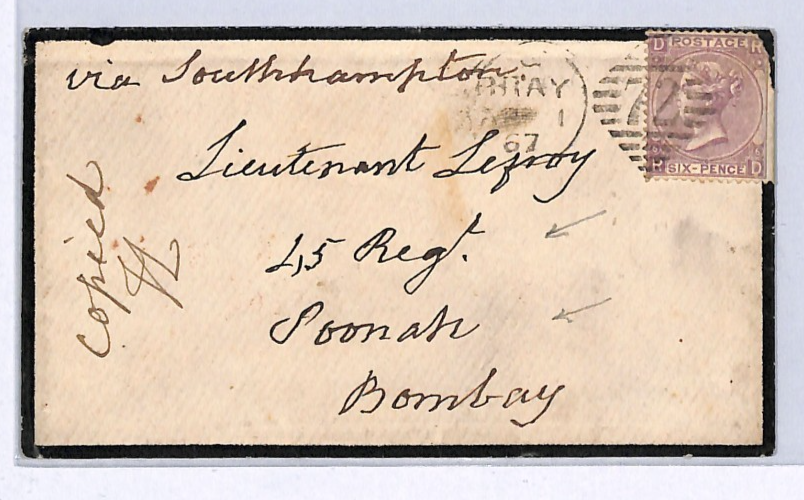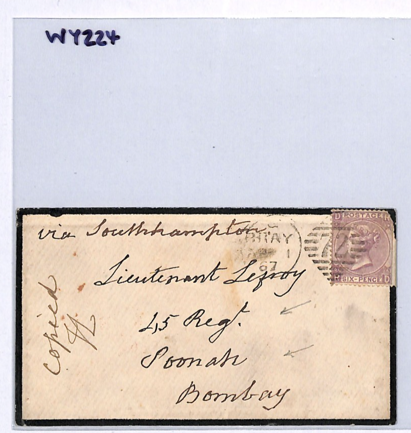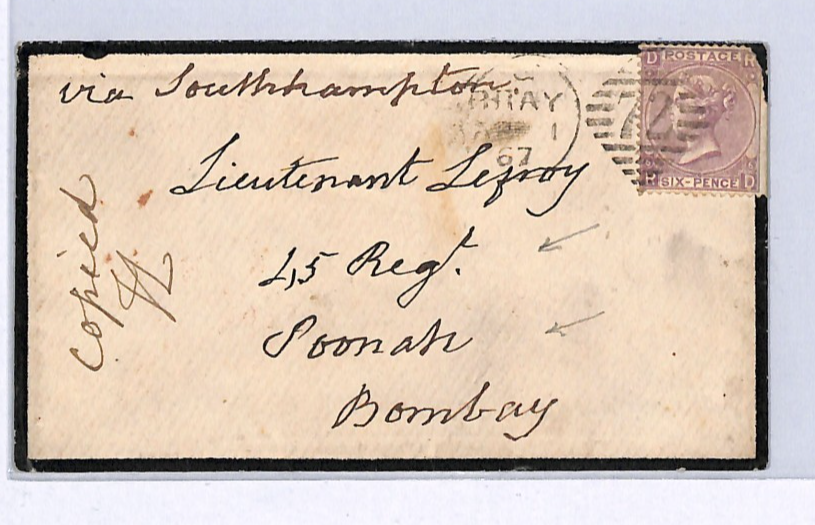 GB IRELAND QV 6d Cover *INDIA MILITARY MAIL* Bray (Wicklow) 1867 Duplex 25th Regiment Poonah MOURNING ENVELOPE WY224