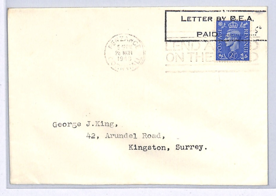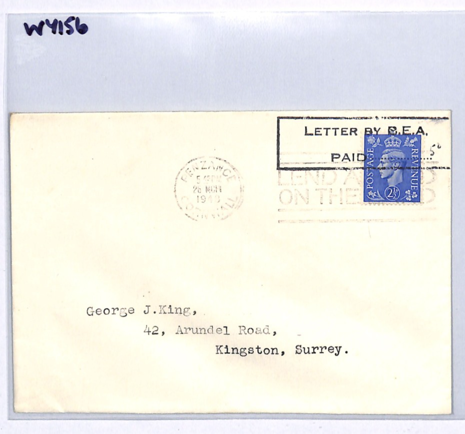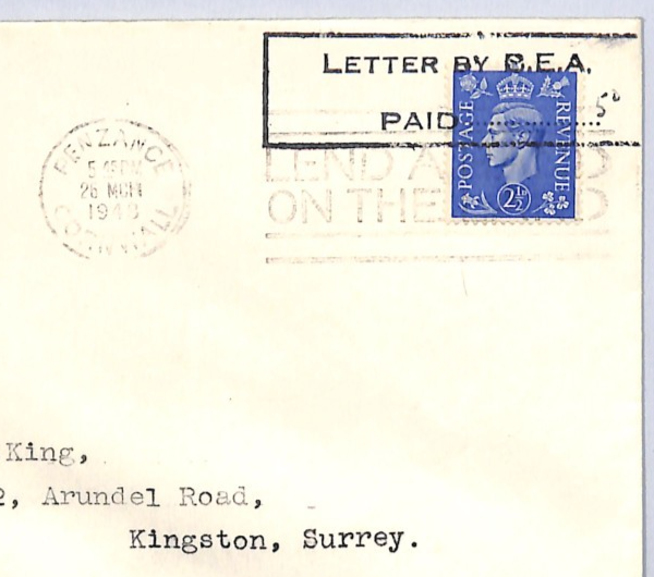 GB BEA Air Mail First Day Cachet? Cornwall Penzance Surrey Kingston 1948 WY156
