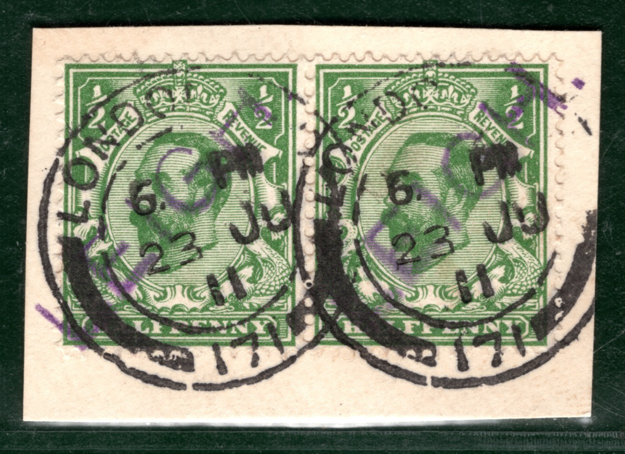 GB KGV Downey ½d Pair Violet *LEIGH* RAILWAY STATION Piece 1911 CDS GR2WHITE47