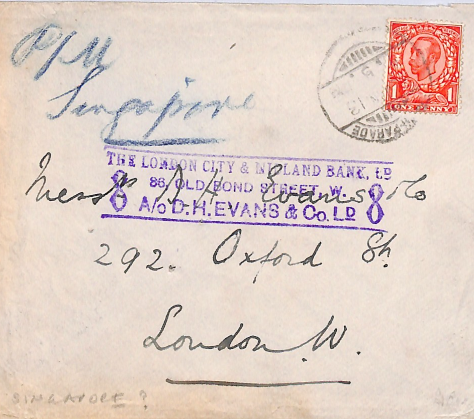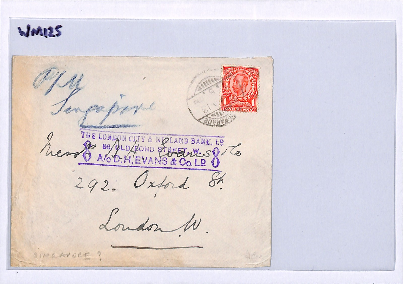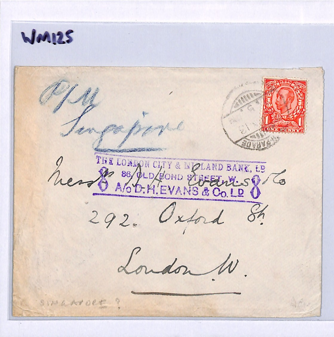 GB KGV DOWNEY USED *SINGAPORE* Cover FORWARDED India Paquebot? 1913 London WM125
