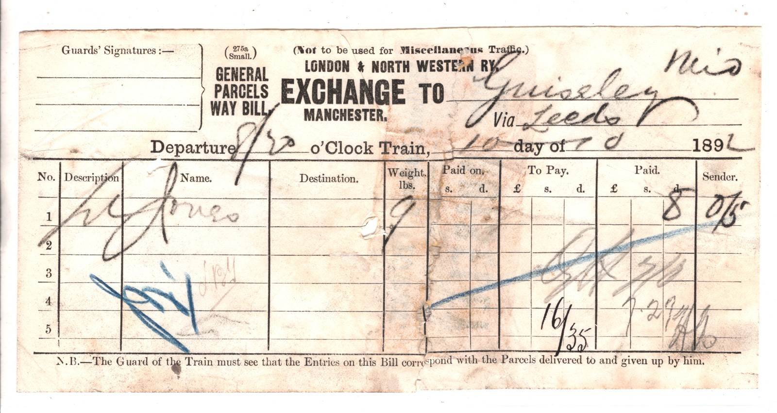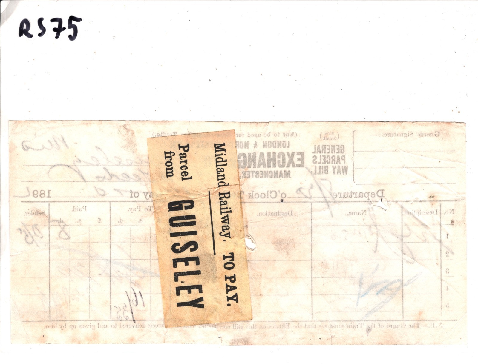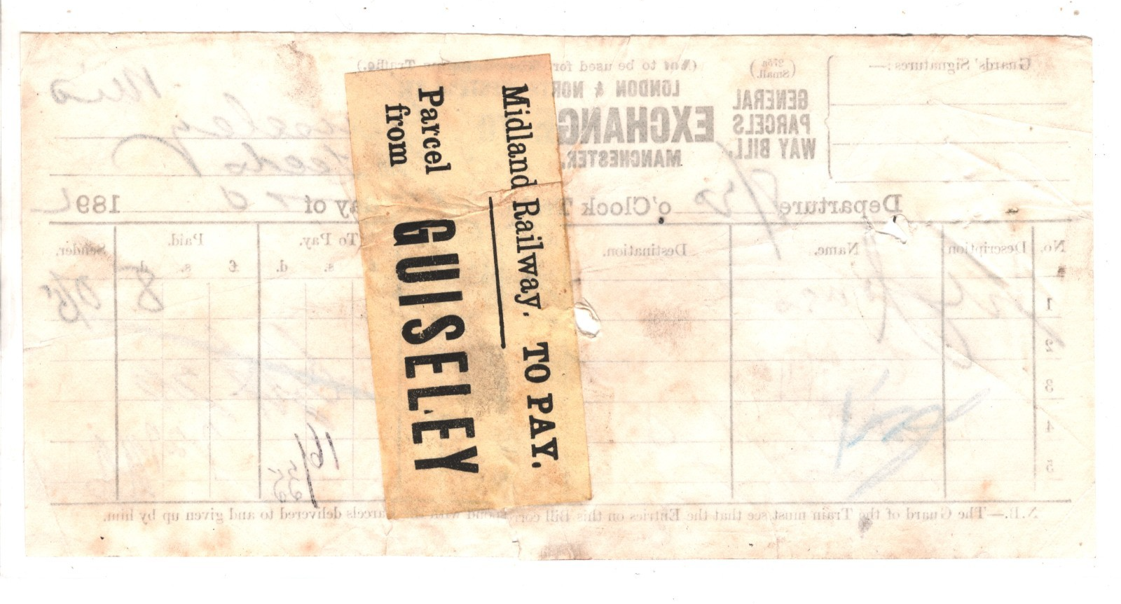 GB MIDLAND RAILWAY Parcel Stamp *TO PAY* GUISELEY Station 1892 LYR Way Bill RS75