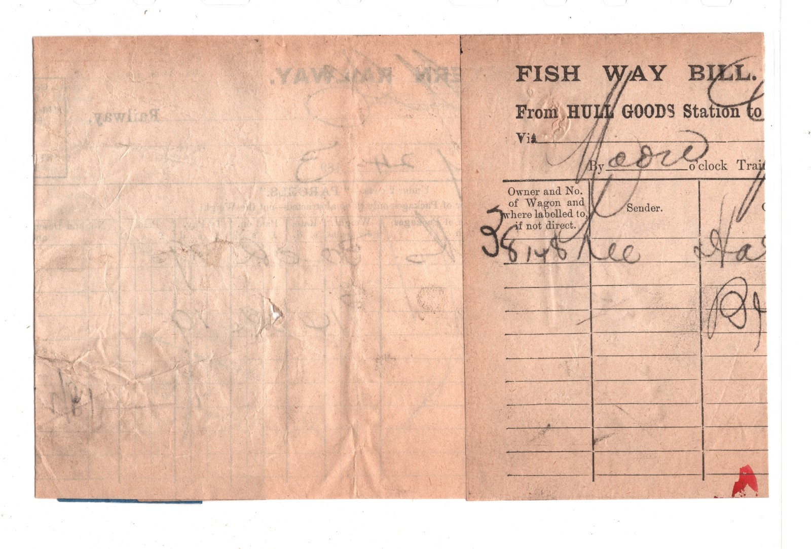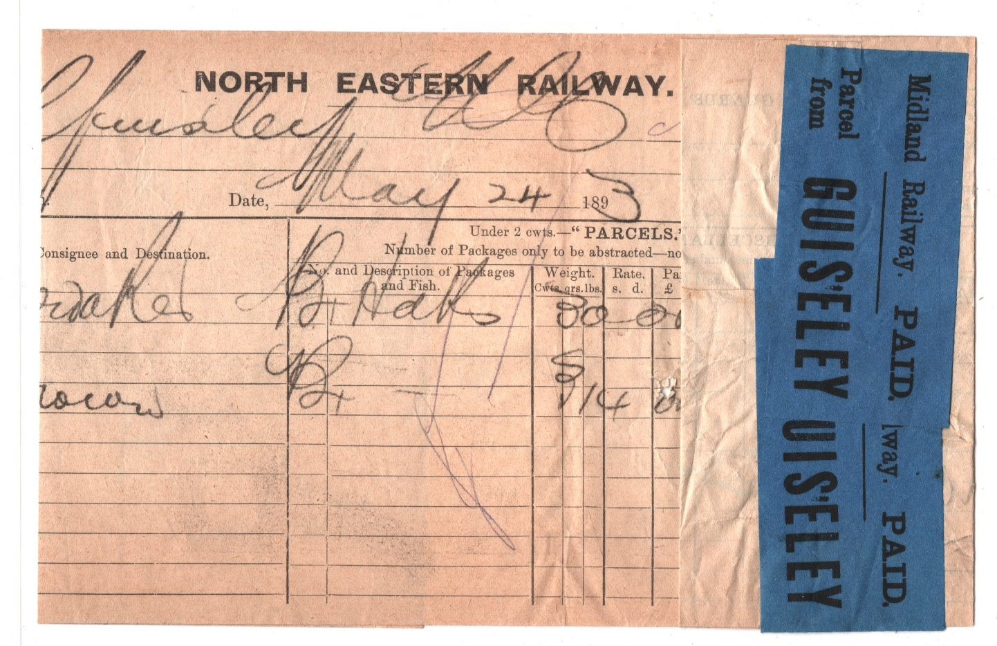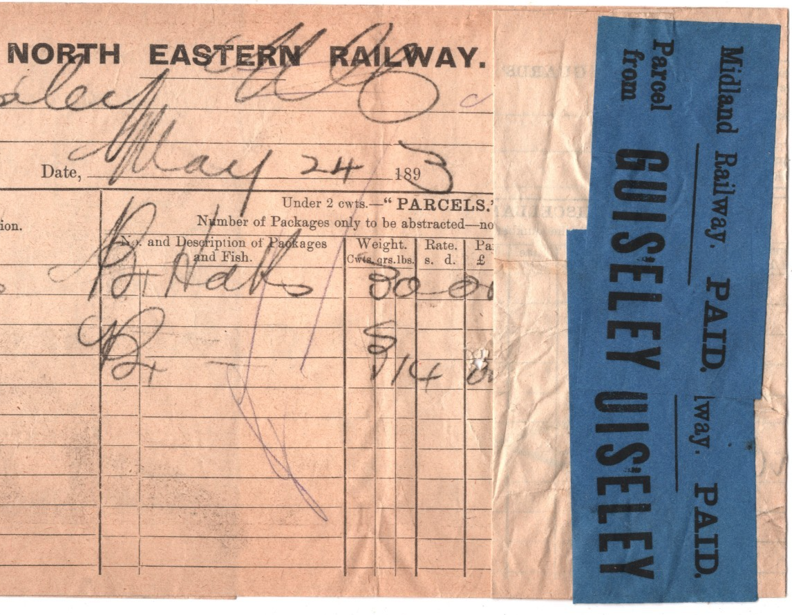 REMARKABLE USE of TWO Blue Paper *PAID* Parcel Stamps of GUISELEY STATION (Yorks). Folded to display. RAILWAY PARCEL STAMP EXHIBITION ITEM from archive lot discovered by Samwells Ltd. NOT OFFERED to collectors previously. VG/Fine for an item of this type & period. Please look at all the scans to help form your own opinion (WAF).