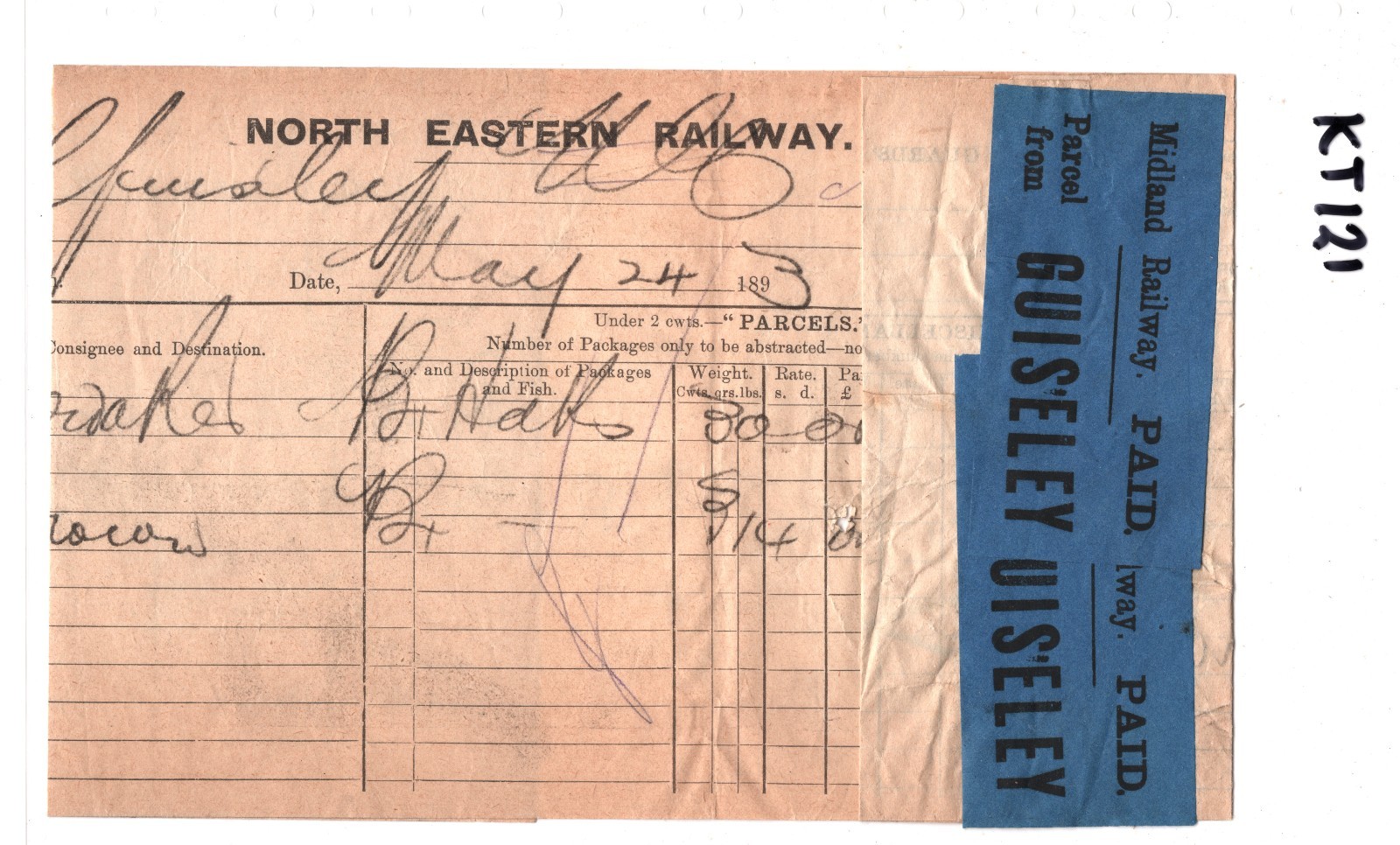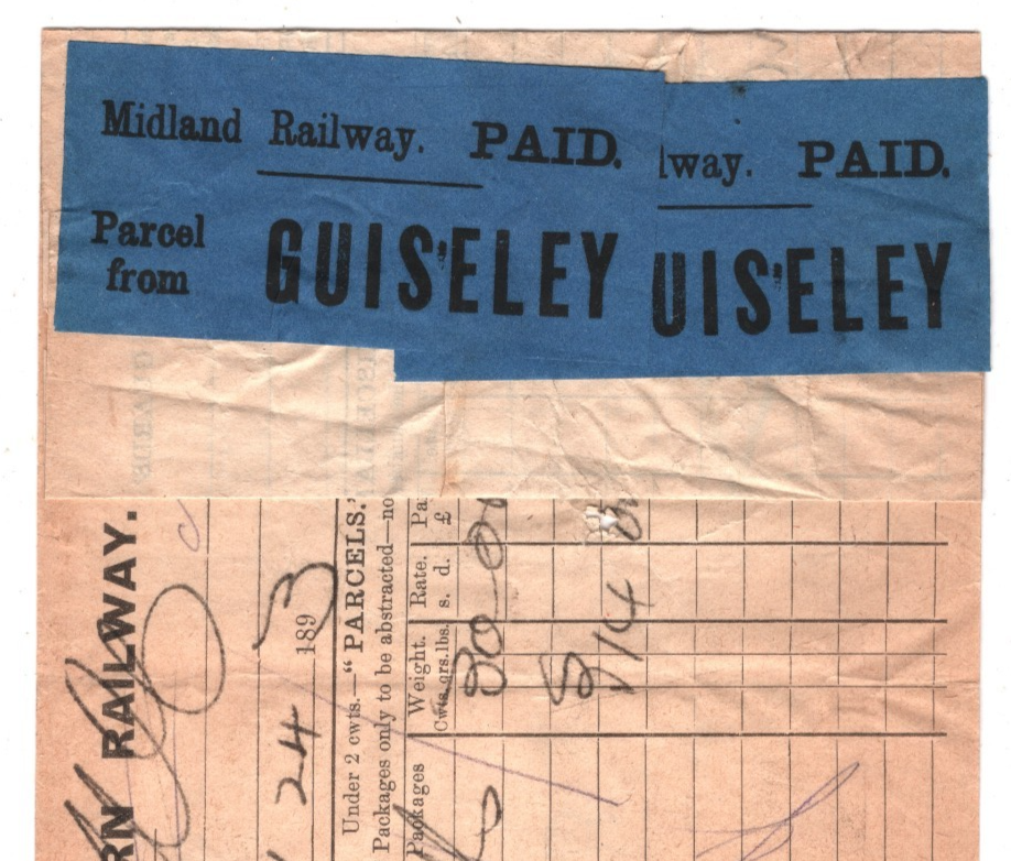GB MIDLAND RAILWAY QV Way Bill *GUISELEY* Blue PAID Parcel Stamp{2} 1893 KT121