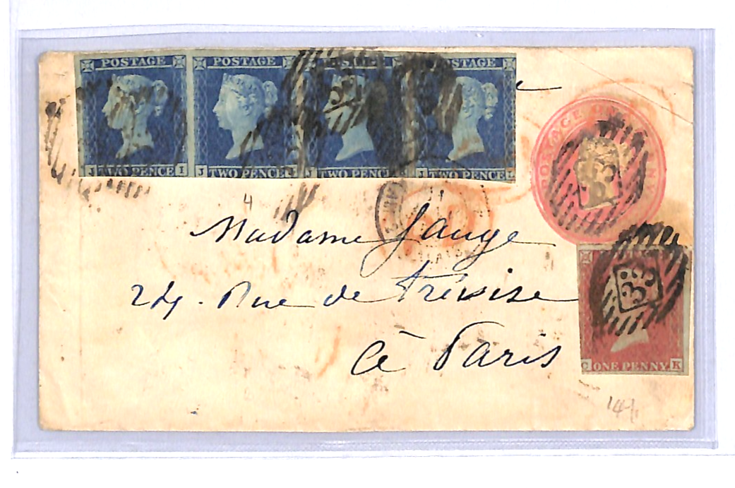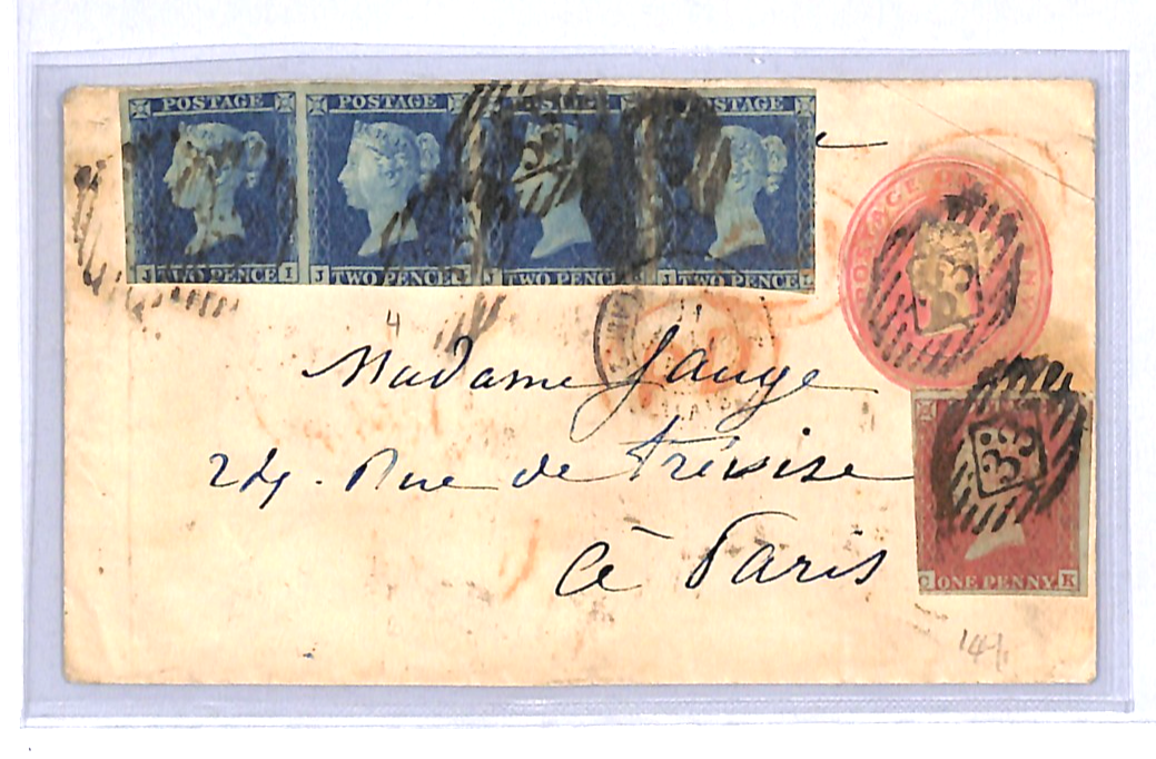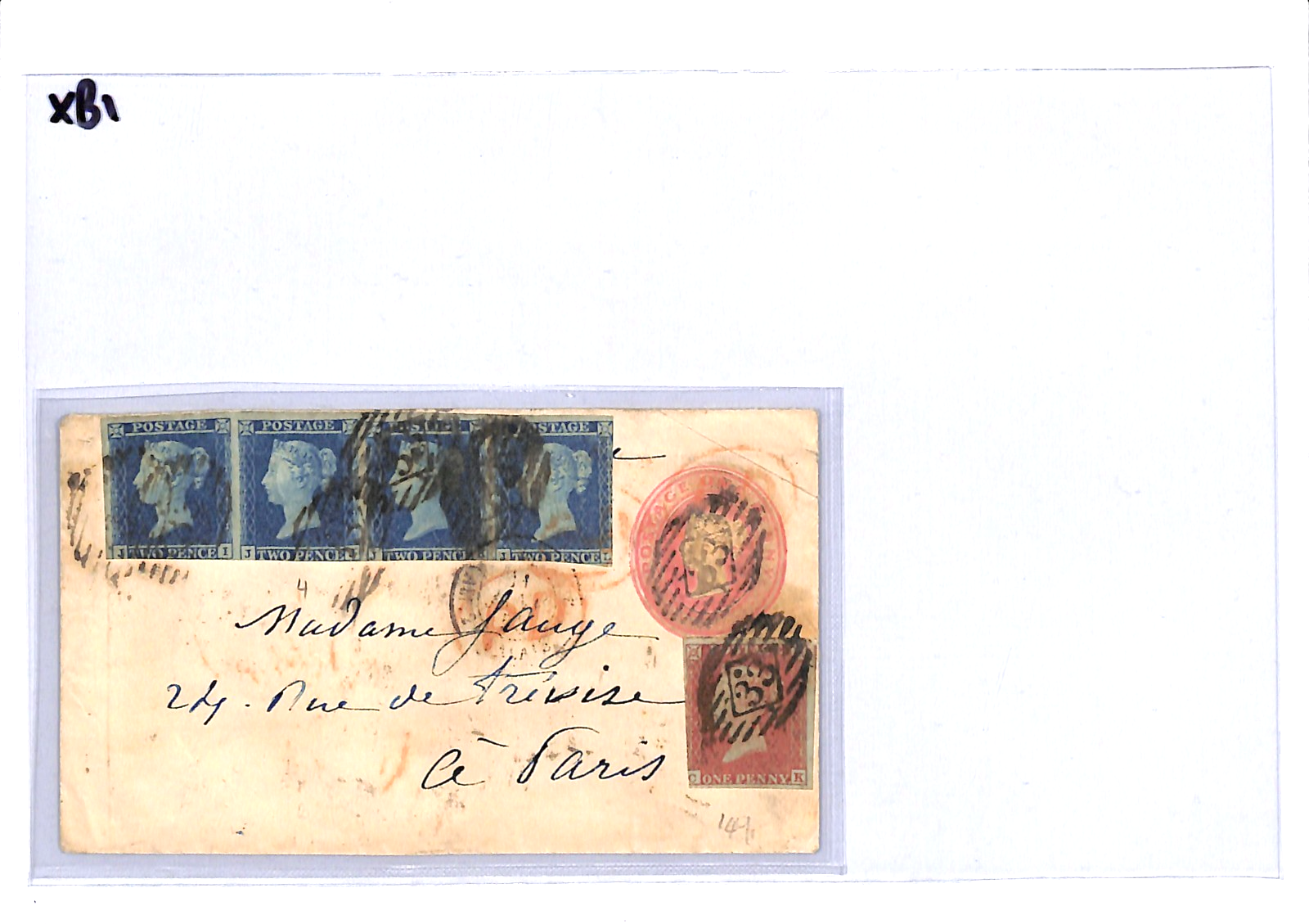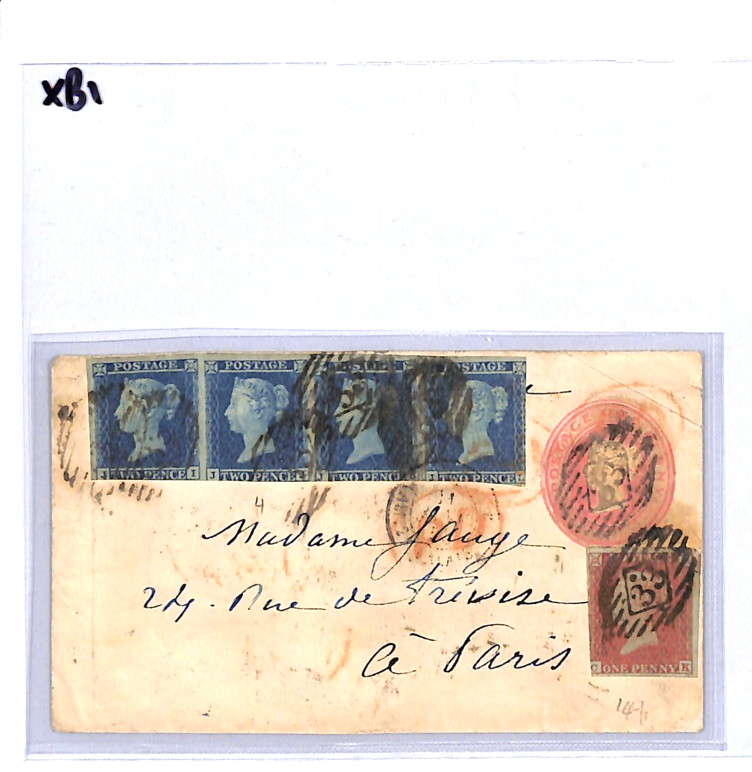 GB PENNY PINK Cover 2d BLUE STRIP 1853 3-Colour Combo DESTINATION MAIL Paris XB1