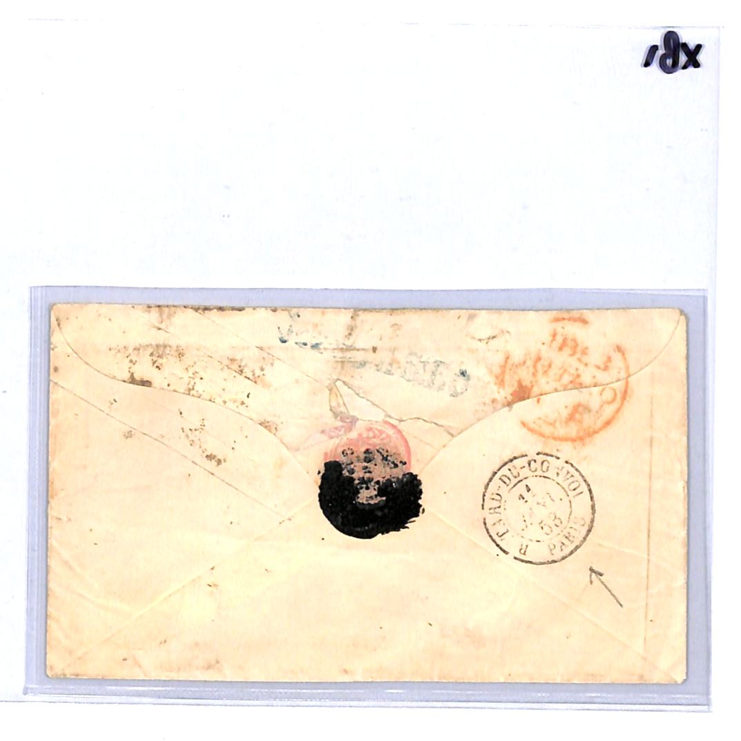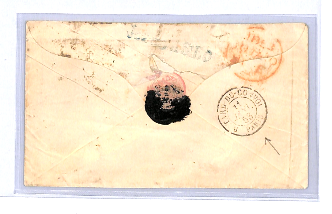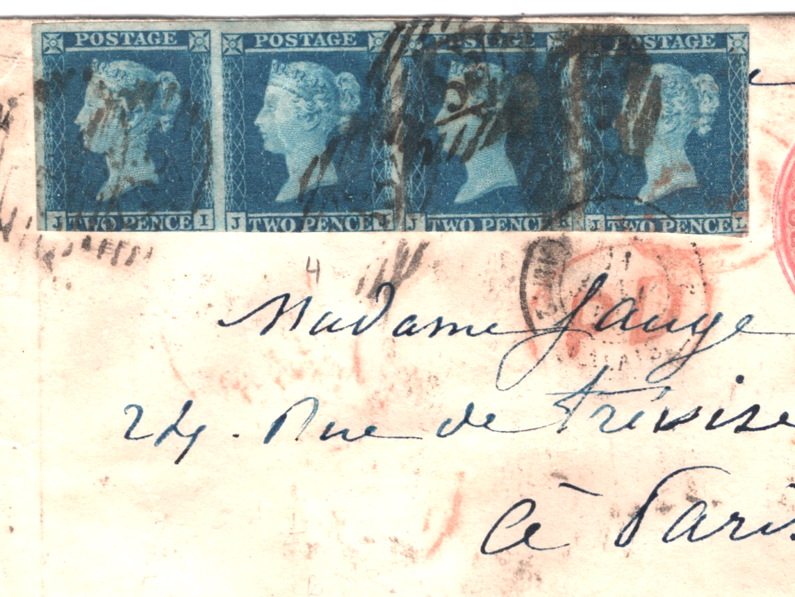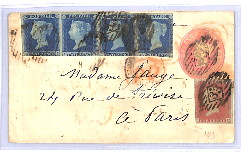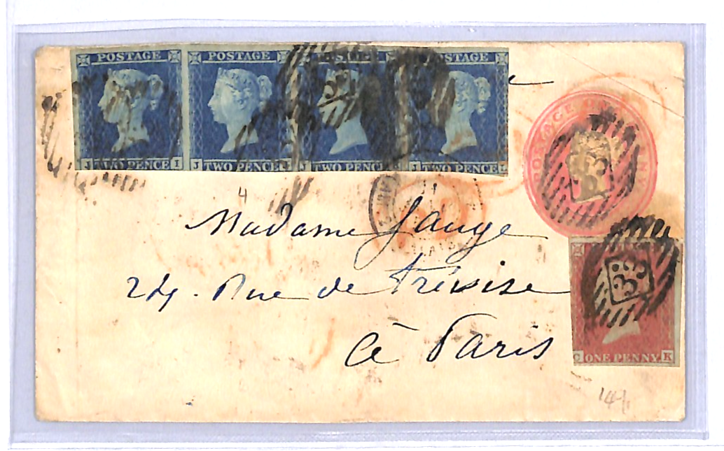 GB PENNY PINK Cover 2d BLUE STRIP 1853 3-Colour Combo DESTINATION MAIL Paris XB1