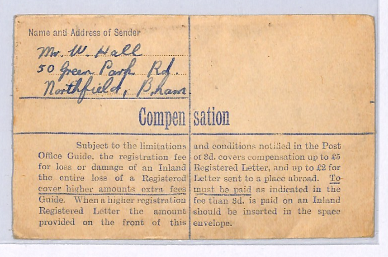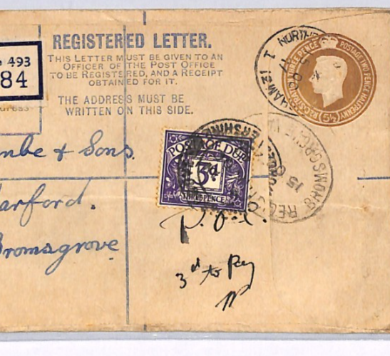 GB POSTAGE DUE *POOC* Cover B'ham REGISTERED Stationery 1947 Bromsgrove XG198