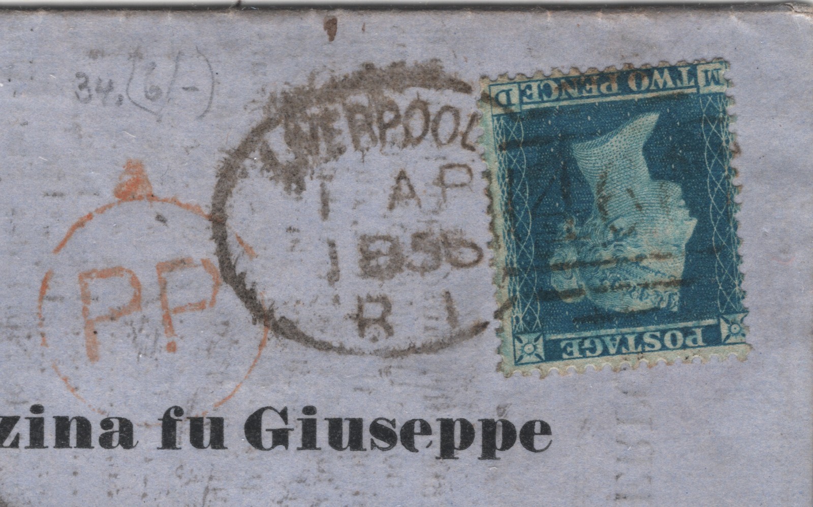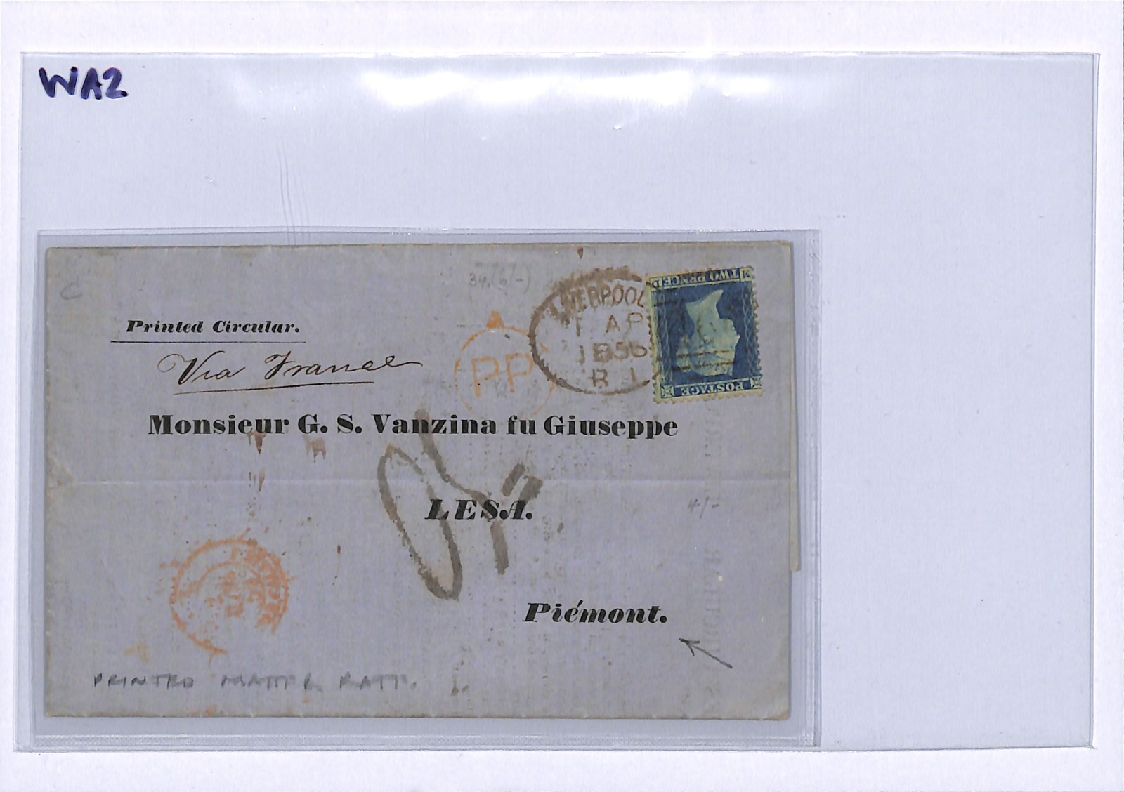 GB QV 2d Blue LIVERPOOL SPOON Cover PIEDMONT 1856 REDUCED RATE PRINT MATTER WA2