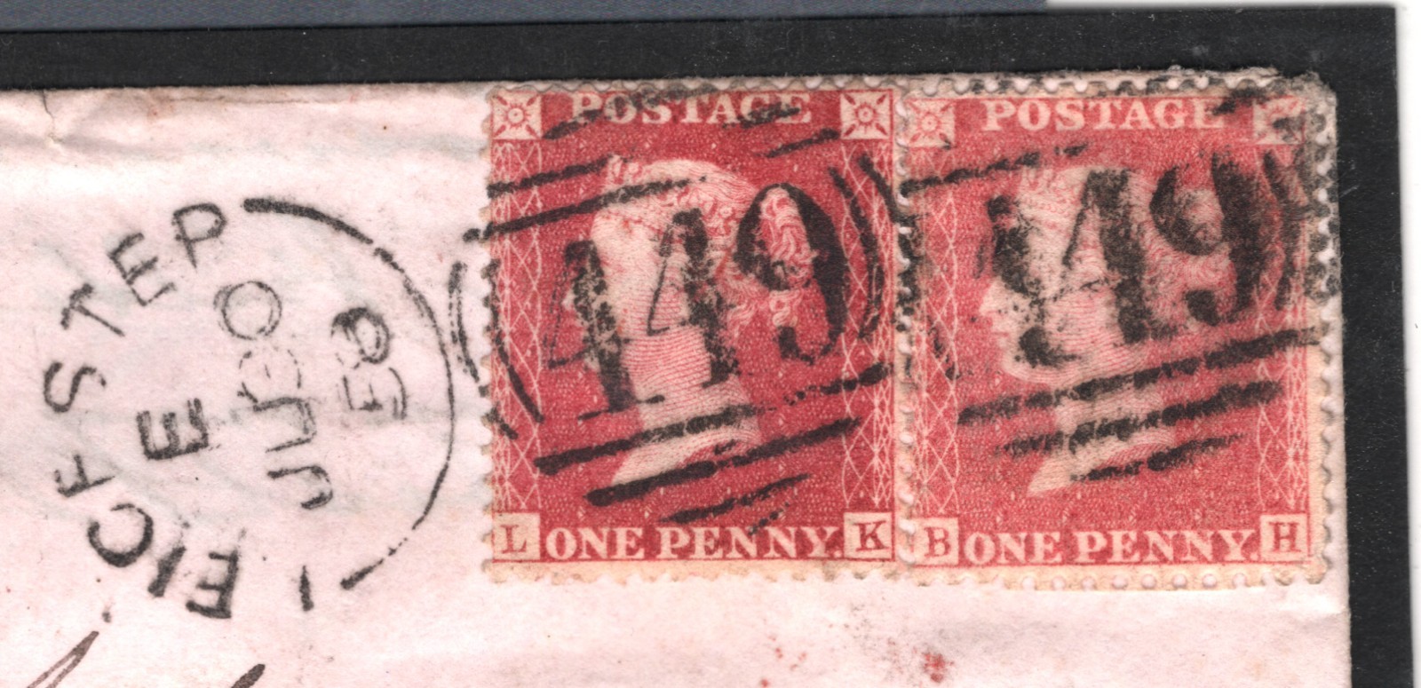 GB QV Cover PENNY RED SHADES SG.39 & 40 Leicester 1858 Sideways Duplex MS2612*