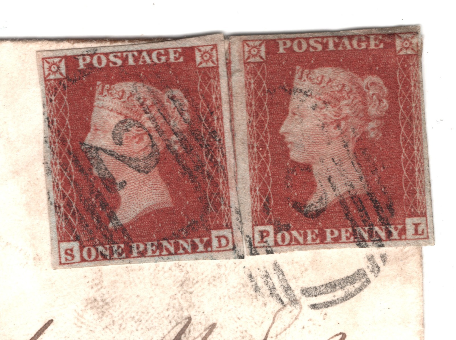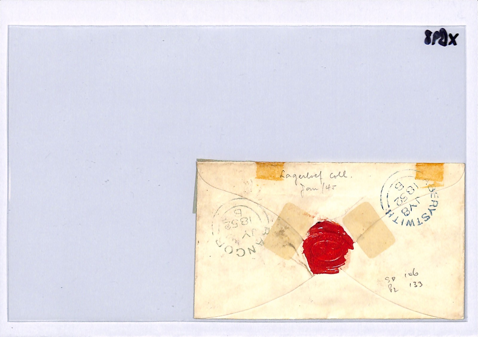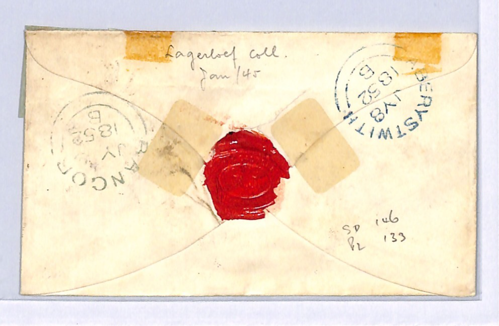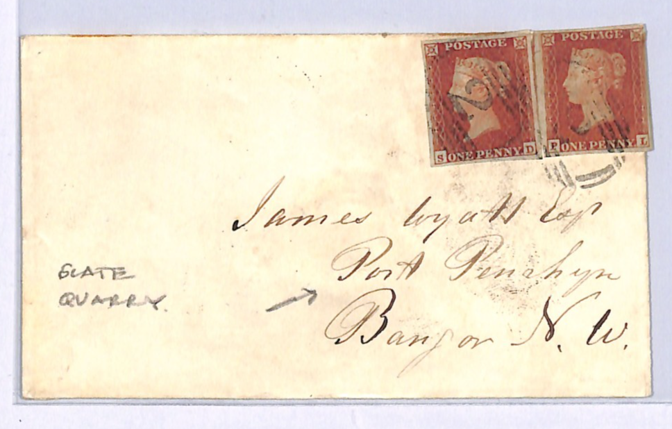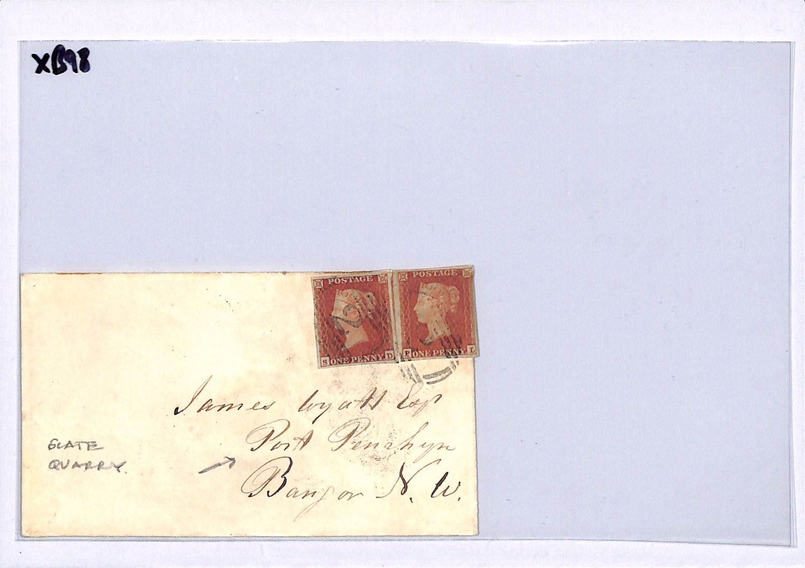 GB PENNY RED Wales Cardigans SG.8var Spec BS91e LAVENDER PAPER Stamps{2} Cover 1852 Aberystwyth Numeral Slate Quarry Bangor 1852 XB98